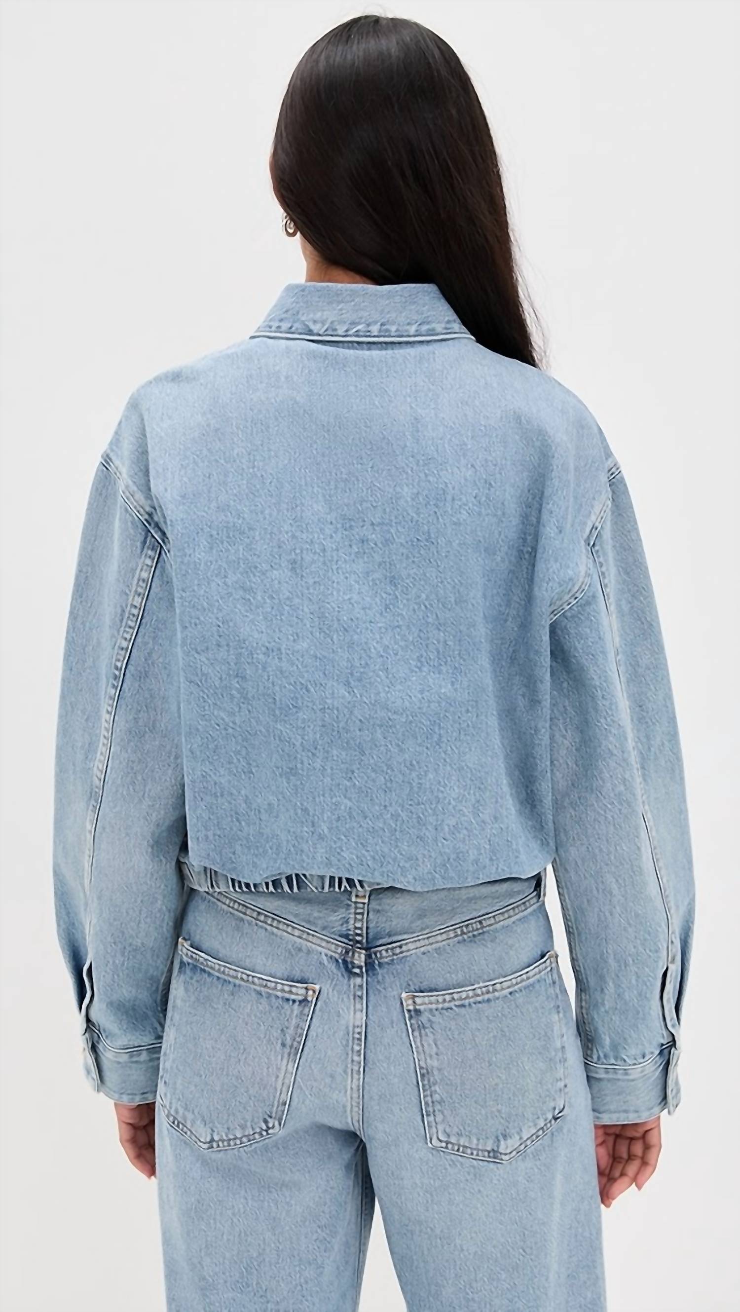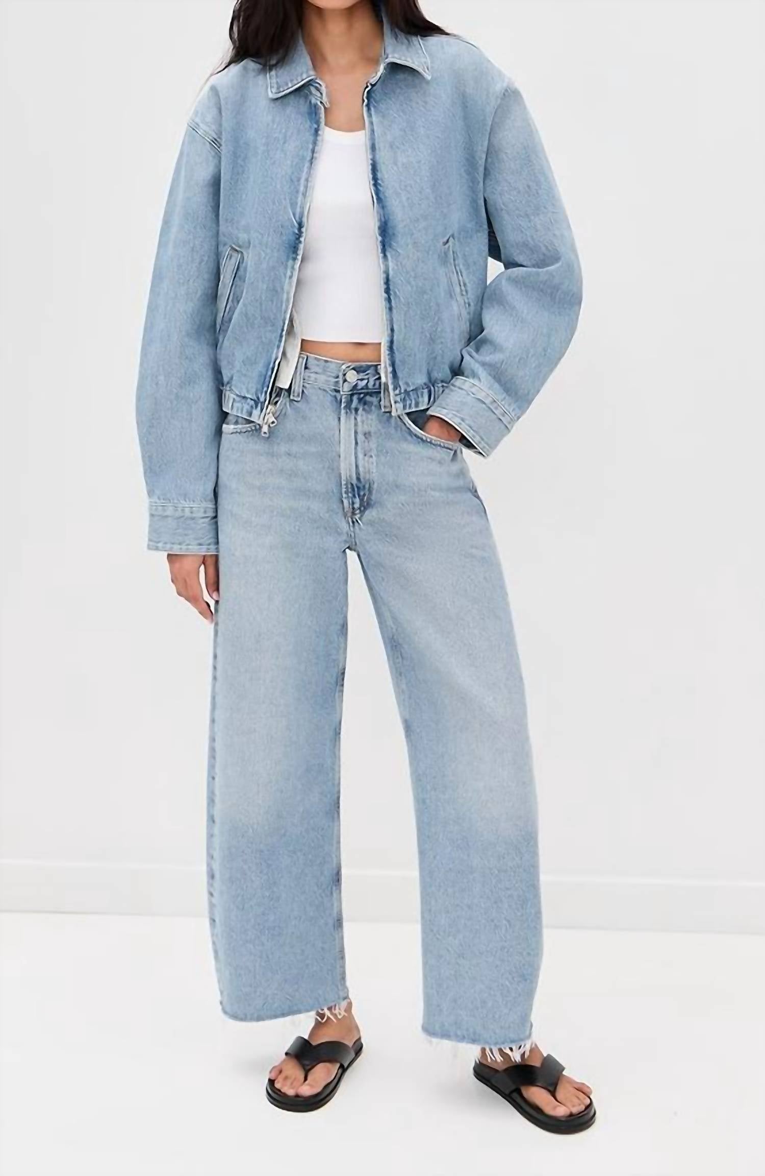 The perfect jean jacket for those slightly crisper days between seasons. Introducing the Women's Nile Jacket by AGOLDE, a standout from the Weightless Collection offering a sleek, modern design in a classic blue denim. This bomber features long blouson sleeves and a classic collar, crafted from 100% cotton for optimal comfort. Made in the USA, it includes a practical front two-way zip closure and two front zipper pockets. Care for this solid minimalist piece is easy with machine wash and tumble dry instructions.