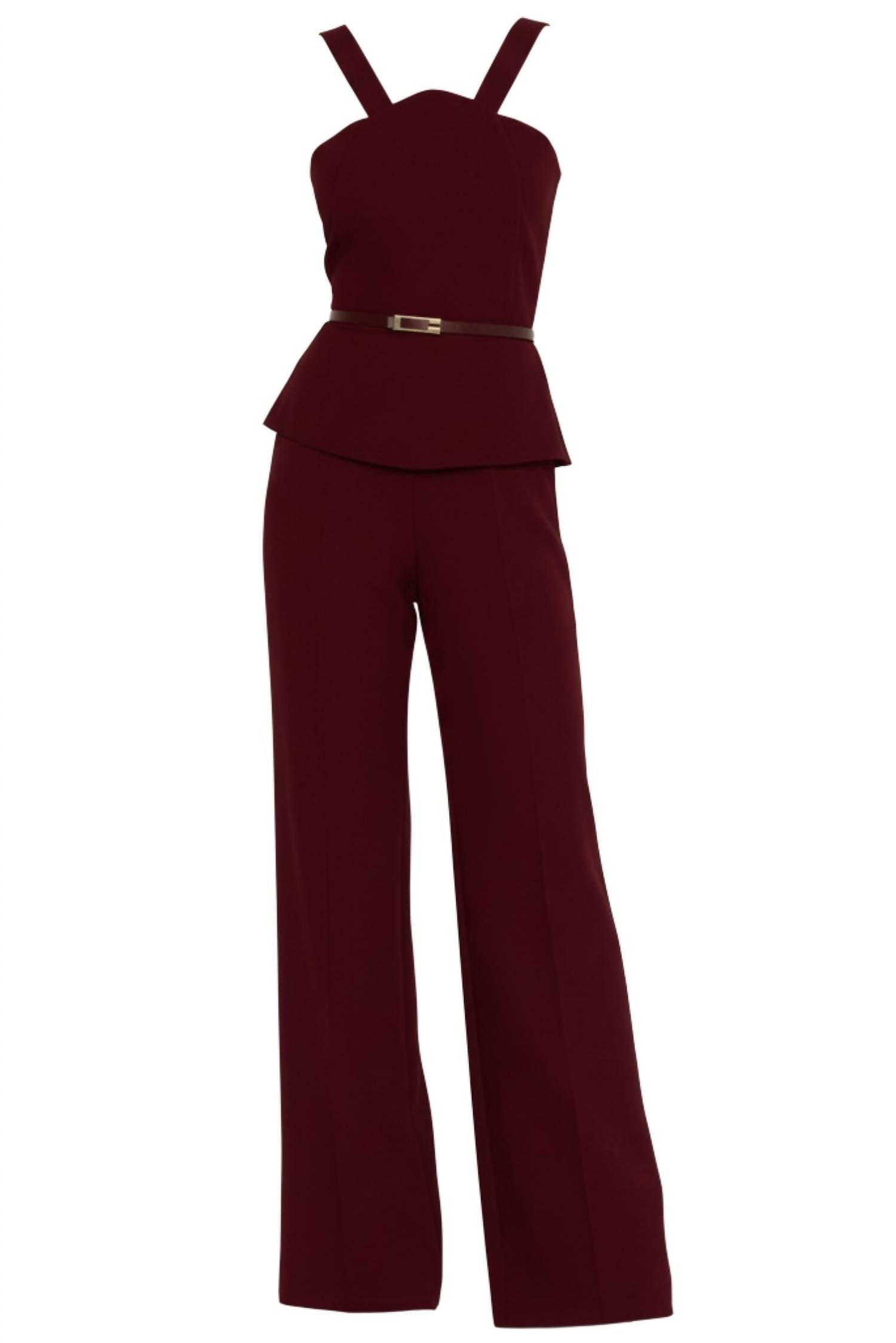 Meet the Ingrid Jumpsuit by Akalia, a stunning piece that combines contemporary elegance with a sophisticated silhouette. This sleeveless, halter design boasts a dramatic peplum waist and an elegant belt with a gold buckle. Made from a blend of 68% polyester, 29% viscose, and 3% spandex, with a 100% cotton lining, it provides both comfort and style. It features a pull-on closure and is crafted in Europe, making it a perfect choice for holiday parties. Care: Cold hand wash.