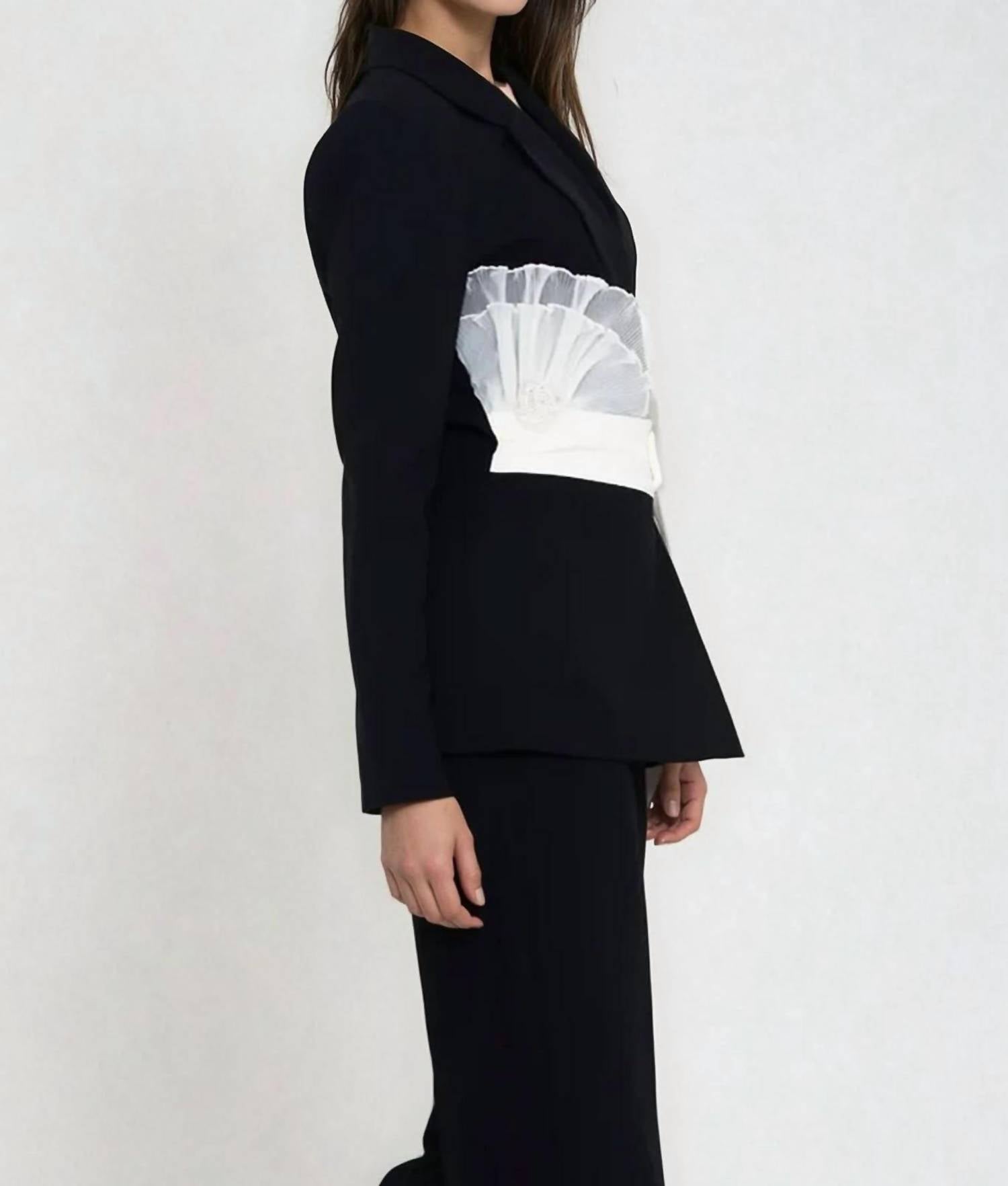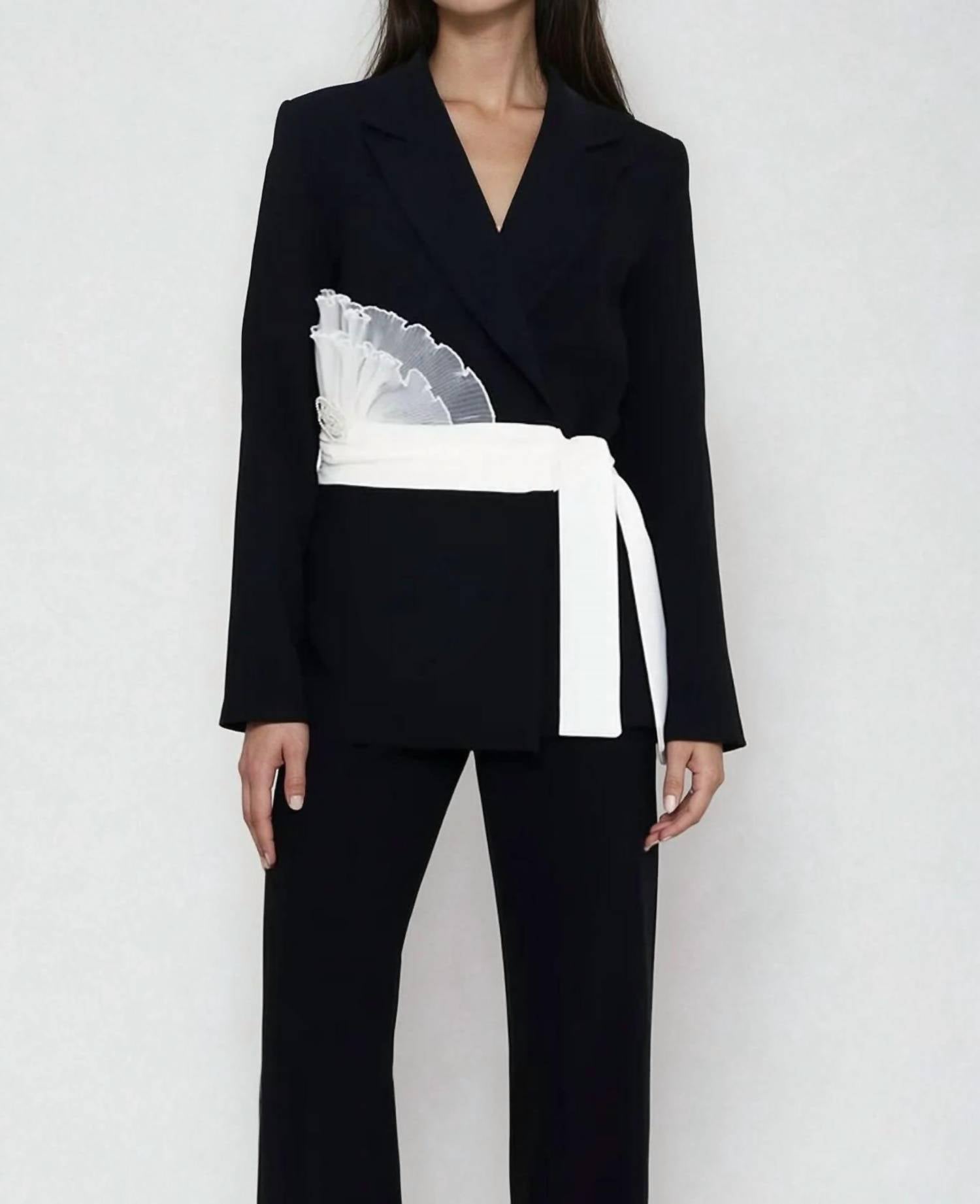 The Akalia Roset Blazer with Belt in black is a perfect addition to a sophisticated wardrobe, offering timeless elegance for any evening event. This piece showcases long sleeves and a refined V-neck with a classic notch lapel, creating a polished look. Made from a comfortable blend of 63% Polyester, 33% Rayon, and 4% Spandex, it features a tie closure with a belt sash and buckle for a flattering silhouette. The blazer is fully lined and designed without pockets, exuding a chic and confident style.