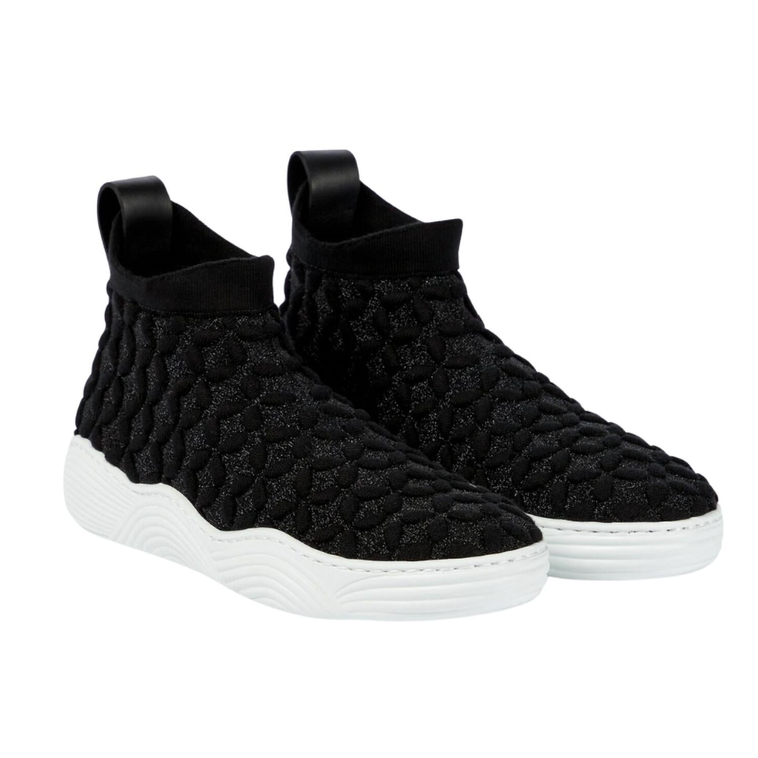 Get your daily steps in with these adorable sneakers. Step up your style game. Crafted in Italy. Boast a signature stretch-knit fabric adorned with the iconic Petale motif, enhanced by leather trim for added luxury. Round toe and rubber sole ensure comfort and durability, making them perfect for transitioning from day errands to evening adventures. Embrace the contemporary fall streetwear trend with these black and white sneakers, ideal for travel and leisurely outings.