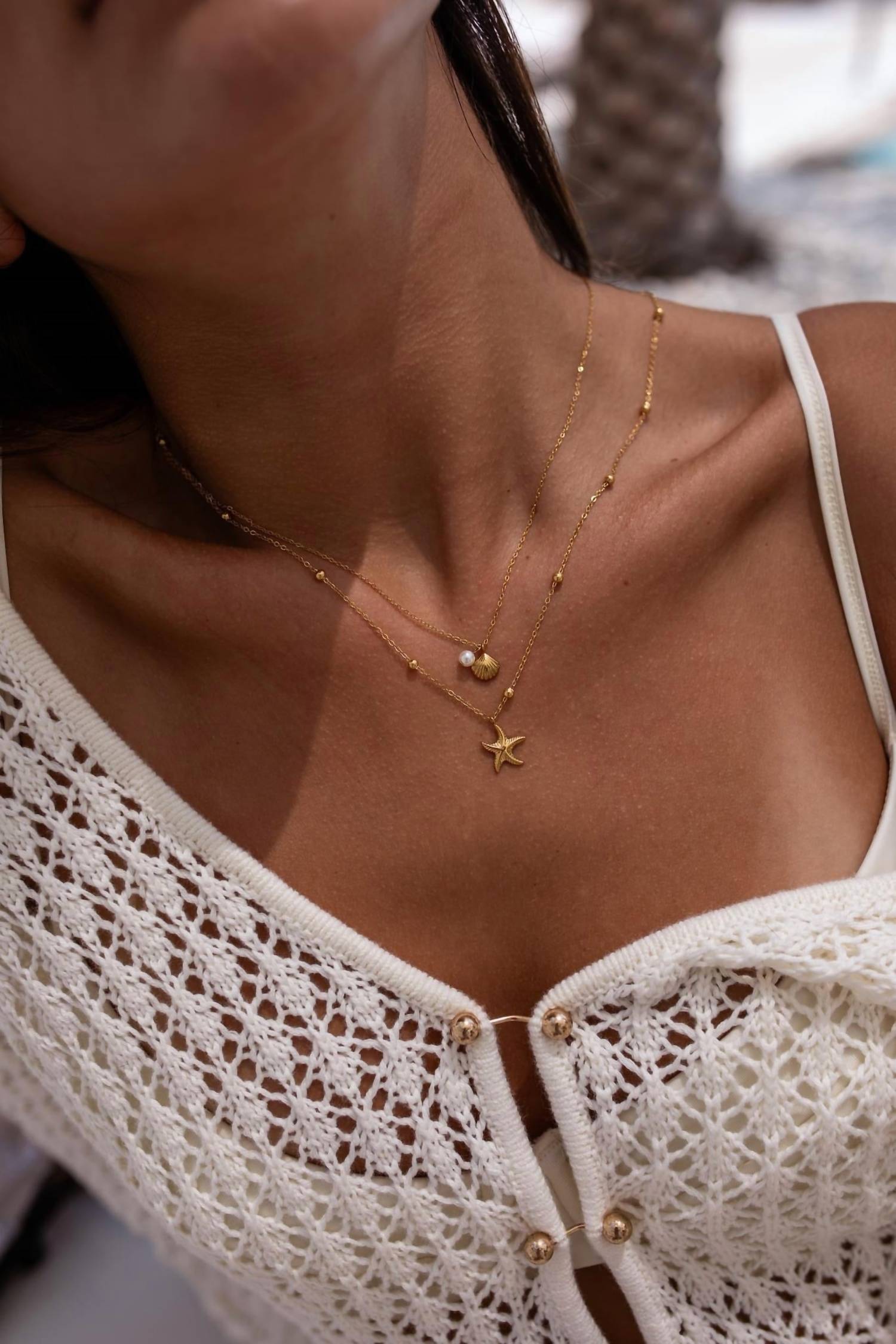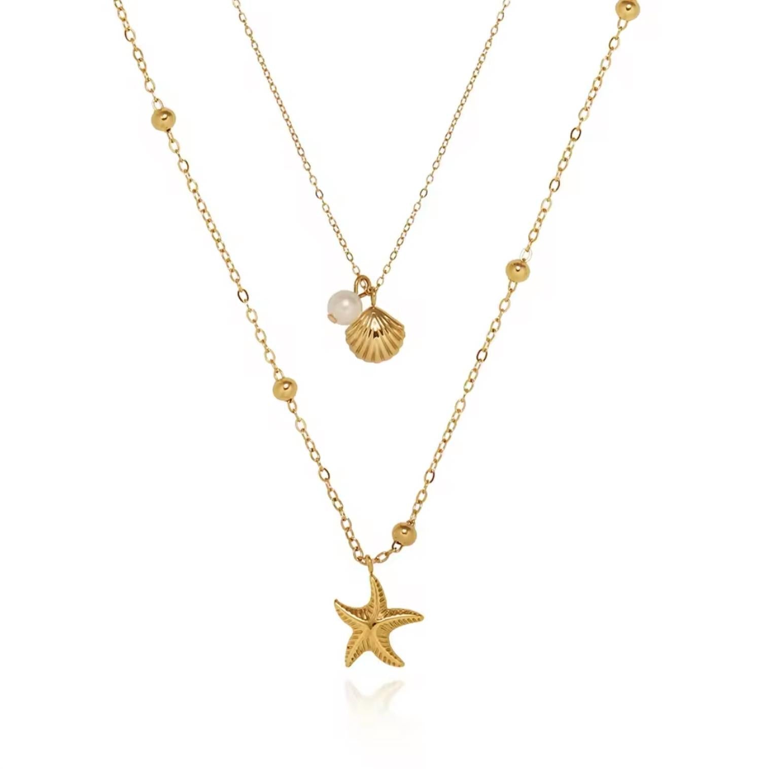 Introducing the Women's Siren Necklace by Alchemy & Co, a perfect blend of elegance and coastal charm in stunning gold. This two-layer fashion necklace features a delicate starfish pendant on the longer chain, complemented by a beautiful shell and pearl duo on the shorter chain. Crafted from 18K gold-plated stainless steel, this jewelry piece is nickel-free, lead-free, hypoallergenic, tarnish, and water-resistant. Closure: Lobster clasp with a 2-inch chain extender for adjustable wear.