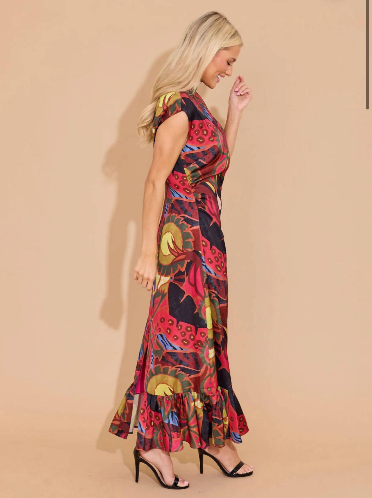 Unveil your bold style with the Estelle Dress by Alden Adair, a captivating piece perfect for evening events. This maxi dress features a high mock-turtle neck and elegant cap sleeves, coupled with a whimsical jungle floral pattern. Material: Polyester. Closure: Pull-on. Care: Machine wash and tumble dry. Designed for the maximalist trend, it's perfect for adding a touch of whimsy to weddings or date nights.