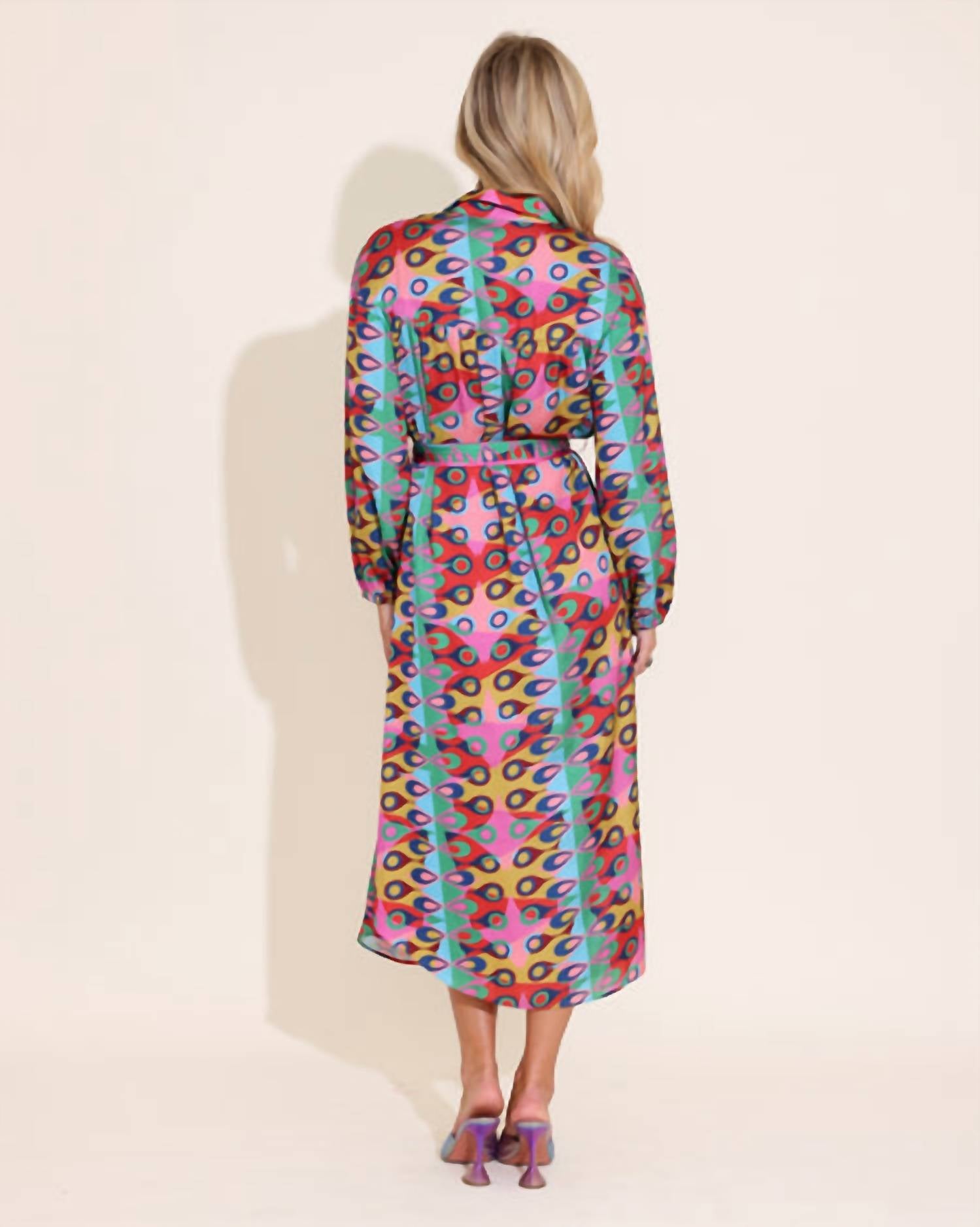 Embrace trendsetting glamour with the Jane Midi Dress by Alden Adair, masterfully crafted for a holiday party in the vibrant shade of Plume. This patterned A-line frock features long sleeves and a classic collar neckline with a button closure, complete with a tie belt to accentuate your silhouette. Composed of 100% polyester in luxurious poly charmeuse, this dress blends boho chic vibes with functionality. Care is simple: machine wash cold and tumble dry low, allowing you to maintain style effortlessly.