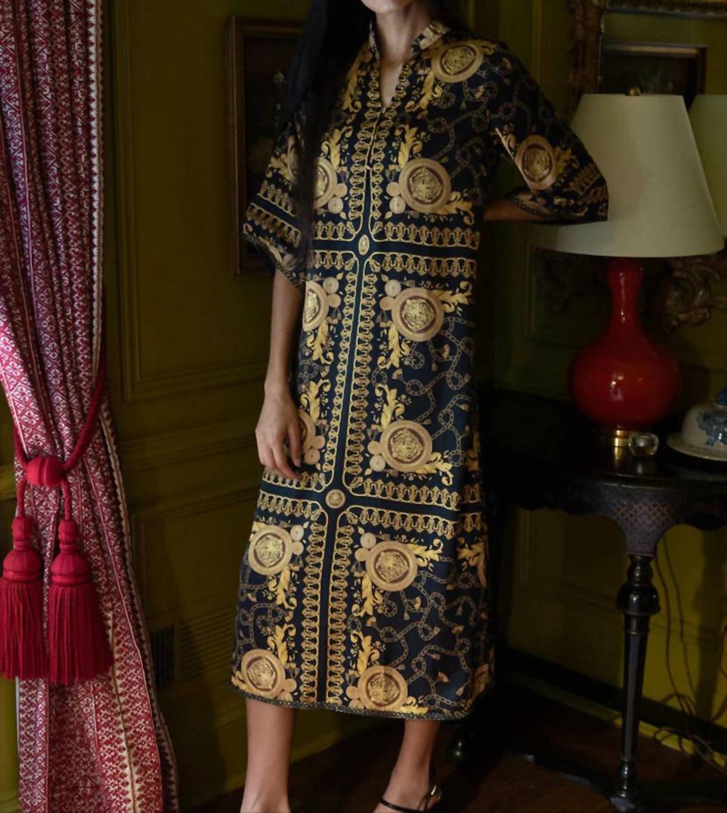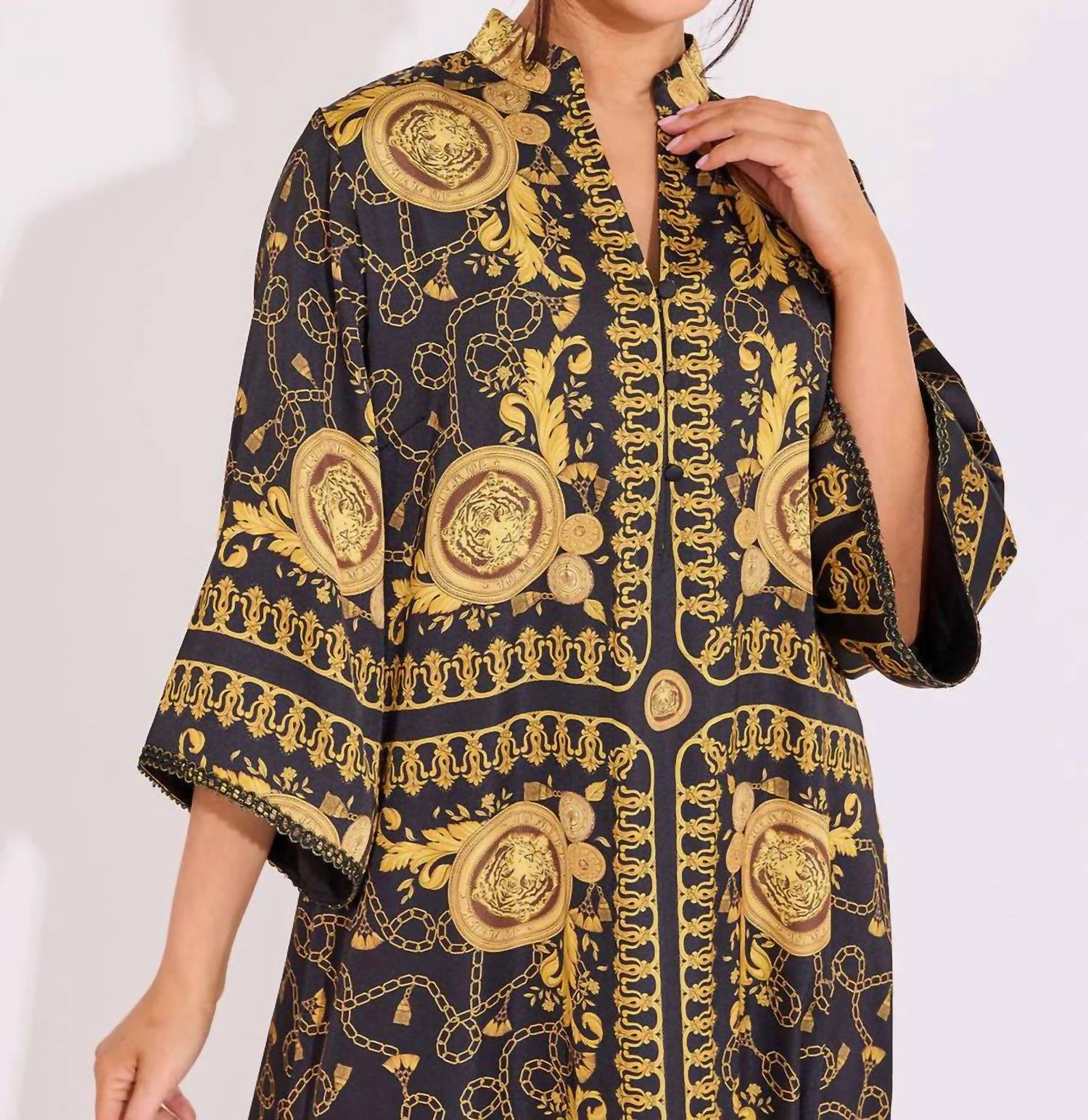 Introduce a touch of elegance to your wardrobe with the Jerry Dress by Alden Adair, a sublime creation in the captivating Donatello color. Featuring three-quarter sleeves, this maxi dress is crafted from 100% poly charmeuse to bring a boho chic vibe to your summer vacation look. Its graphic pattern and kaftan silhouette exude sophistication, enhanced by a practical pull-on closure. Made in China, this piece is machine washable and requires line drying to maintain its gorgeous allure.