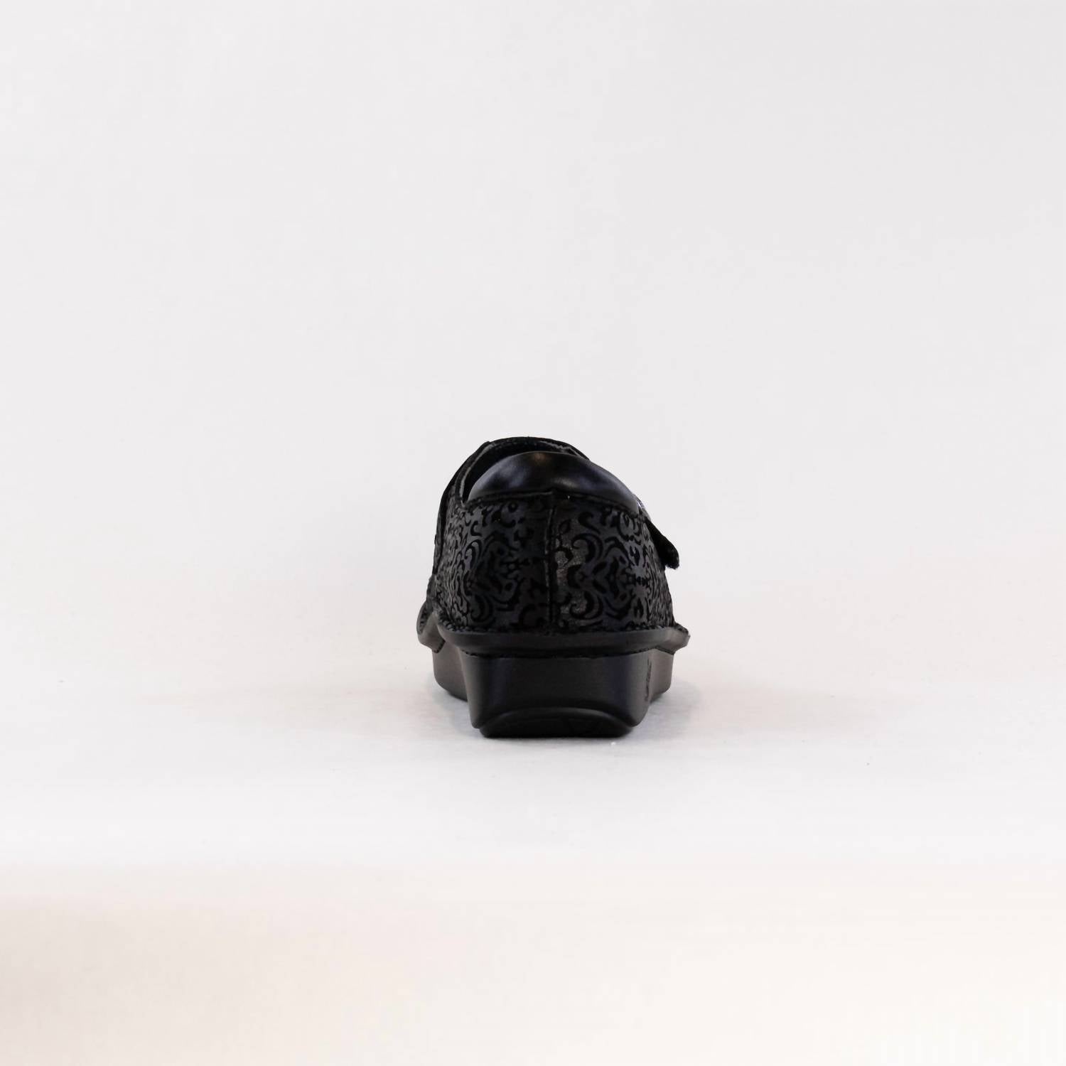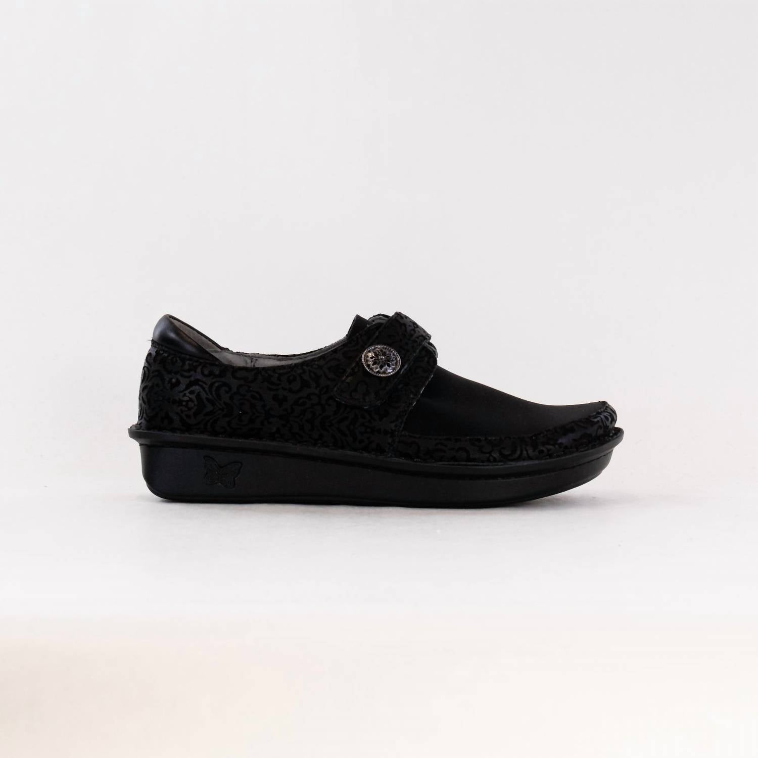 A preppy yet feminine take on the classic loafer.Medallion buckle on the adjustable hook-and-loop strap. Black on black velvet vine pattern on the leather upper. Neoprene fabric. Mild rocker outsole with hand stitching and signature ergonomic footbed. Heel height: 1.25".