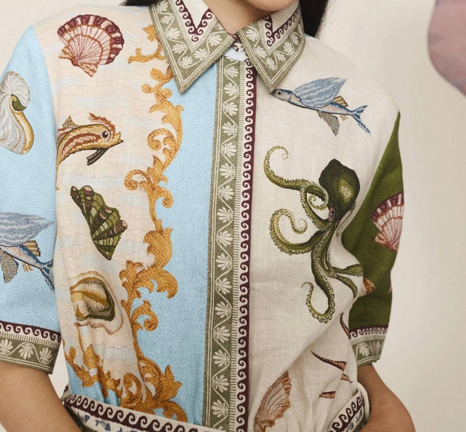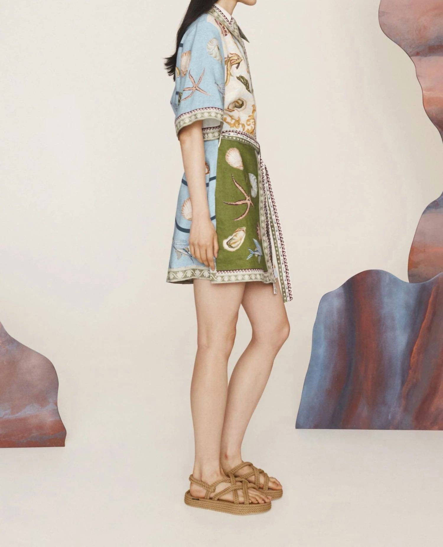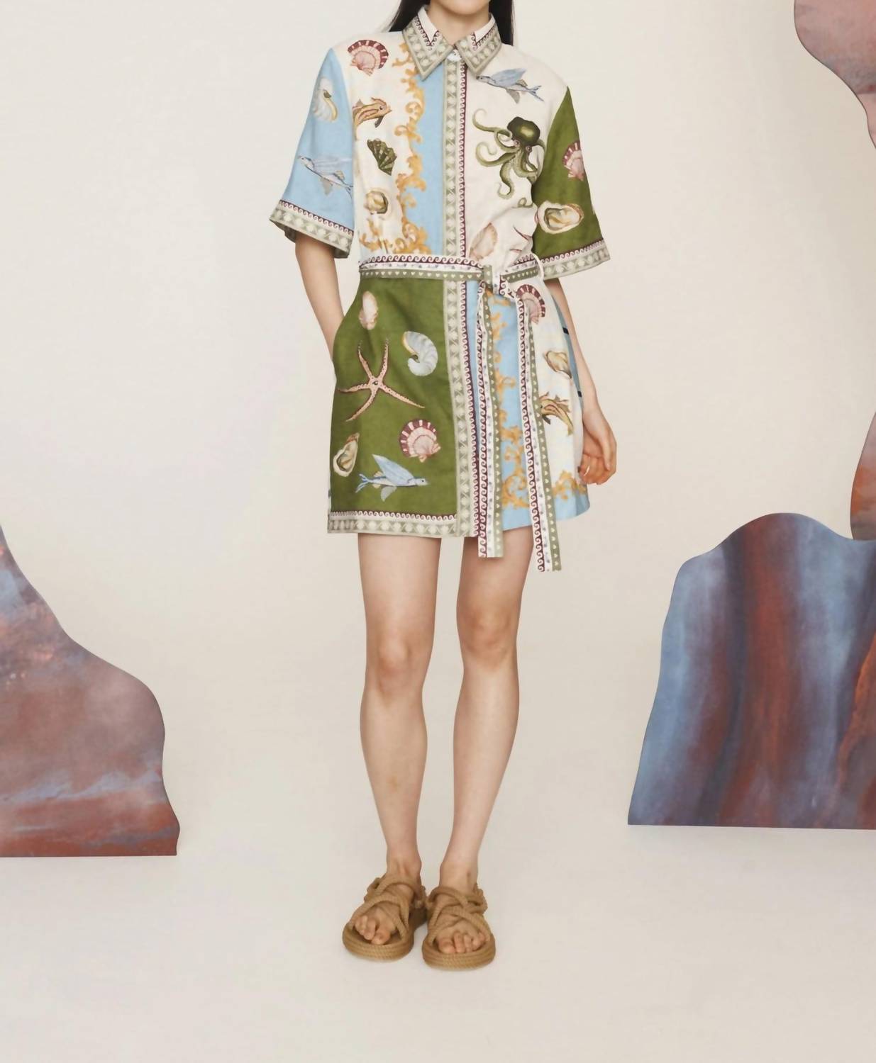 Introducing the Bath House Mini Dress by ALEMAIS, a vibrant graphic masterpiece crafted from 100% European Flax Linen. This mini dress features short sleeves and a flattering shirt silhouette, complete with a point collar and concealed placket adorned with self-covered eyelet buttons. The dress includes practical in-seam pockets and a self-tie belt, and the skirt is elegantly lined for added comfort. Care instructions: Not available, closure type is button closure.
