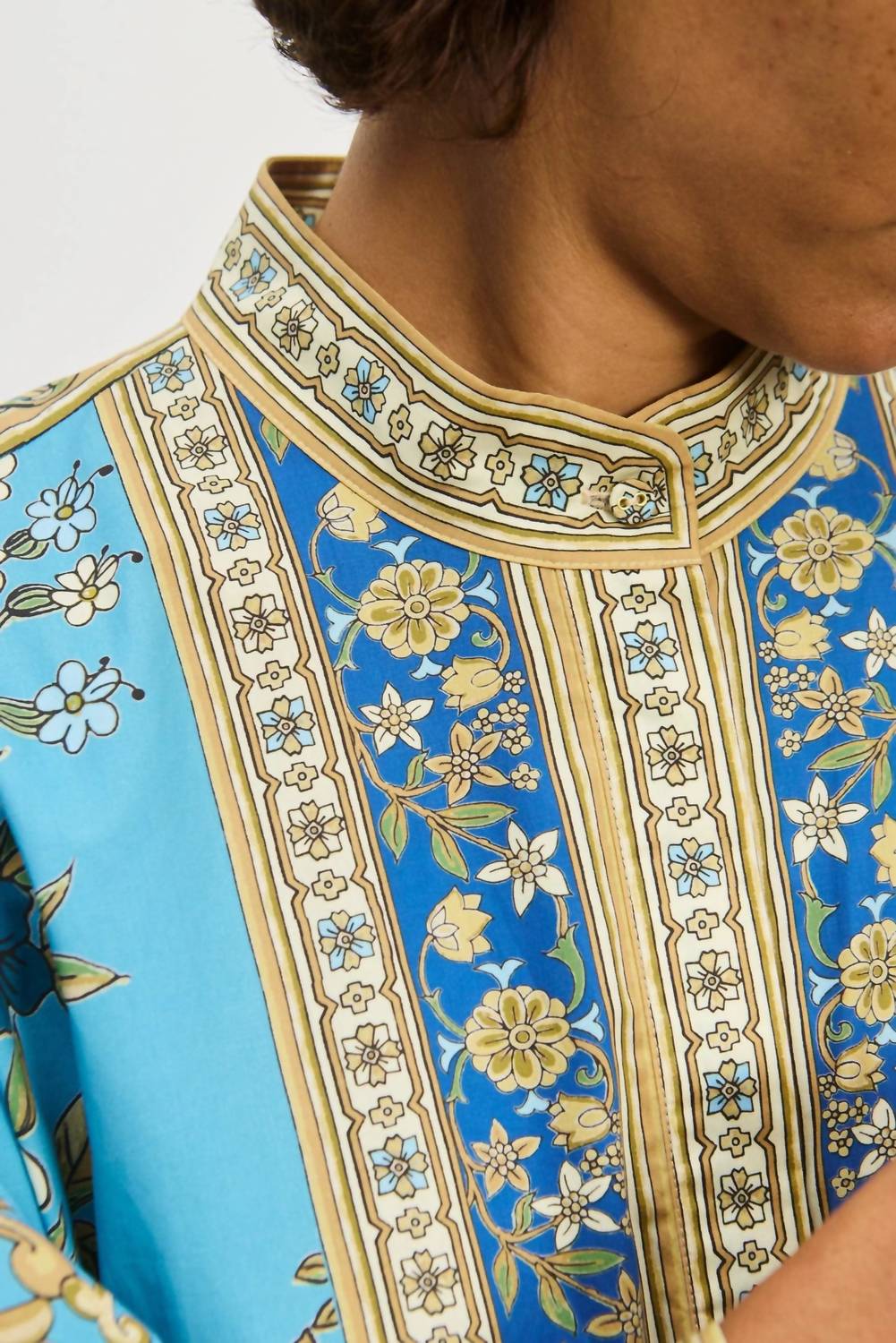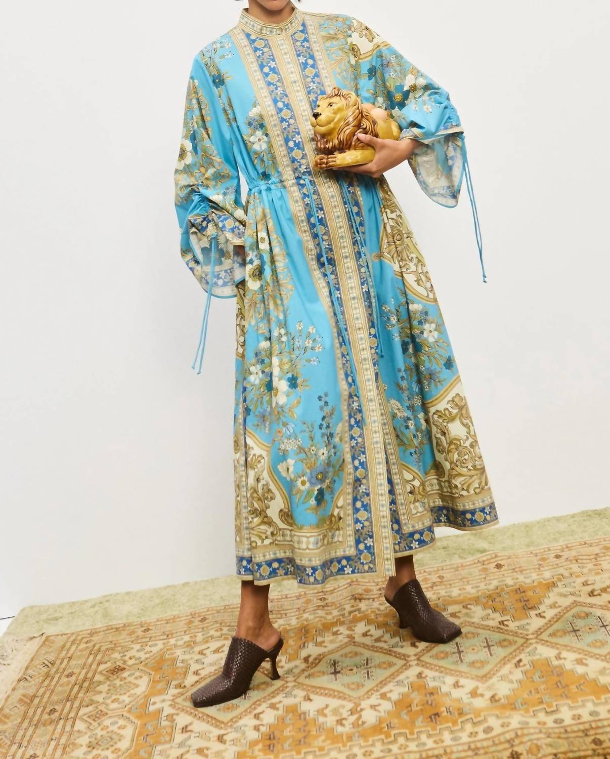 Introducing the Cassie Pool Dress by ALEMAIS, an elegant piece featuring a relaxed shirtdress silhouette perfect for spring. This blue floral dress showcases long sleeves with drawstring details and a practical drawstring waist with toggles for a flattering fit. Crafted from 100% Organic Cotton Poplin, it combines style and sustainability, enhanced by a round neck collar stand and a concealed button placket with self-covered buttons. Closure: Button closure.