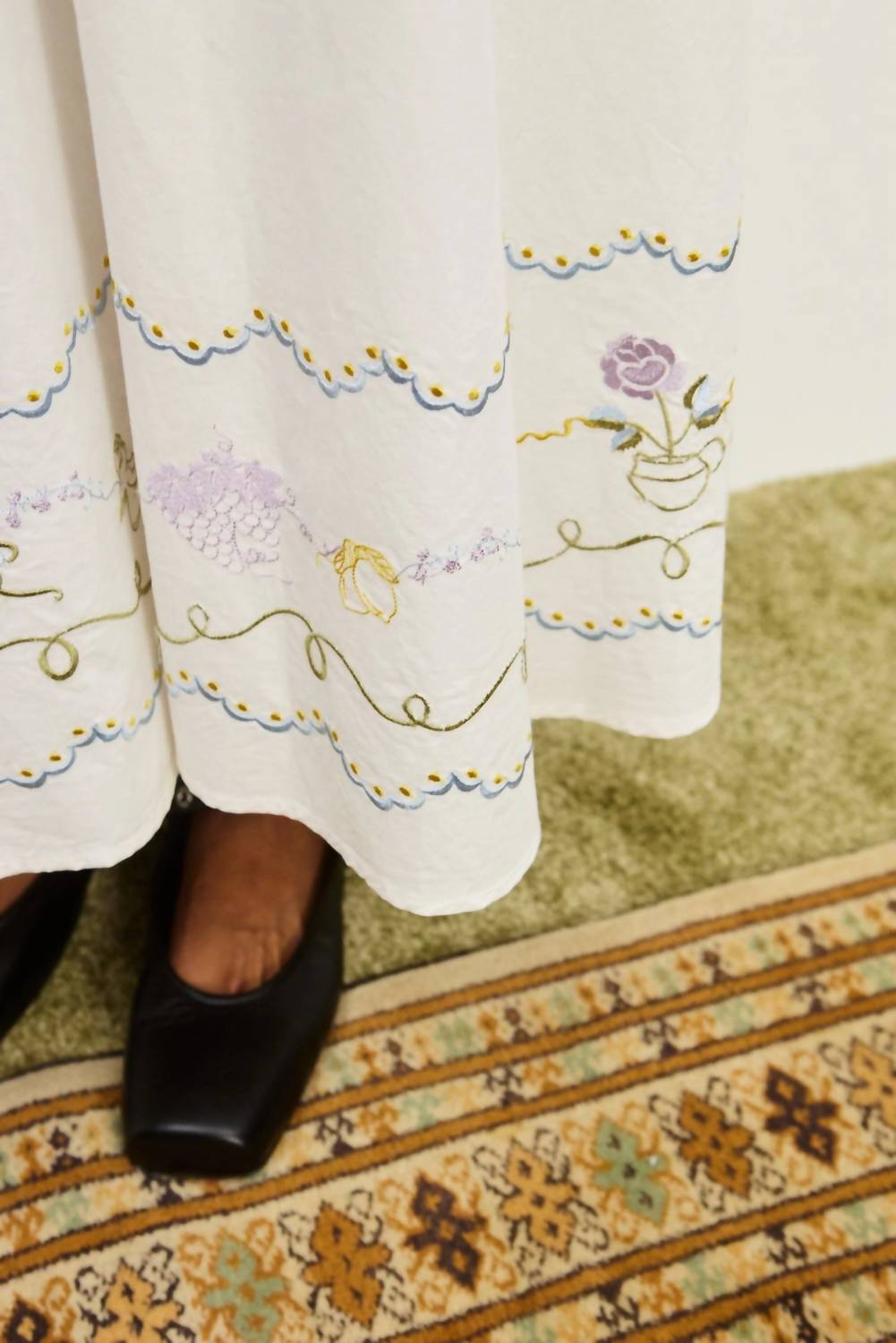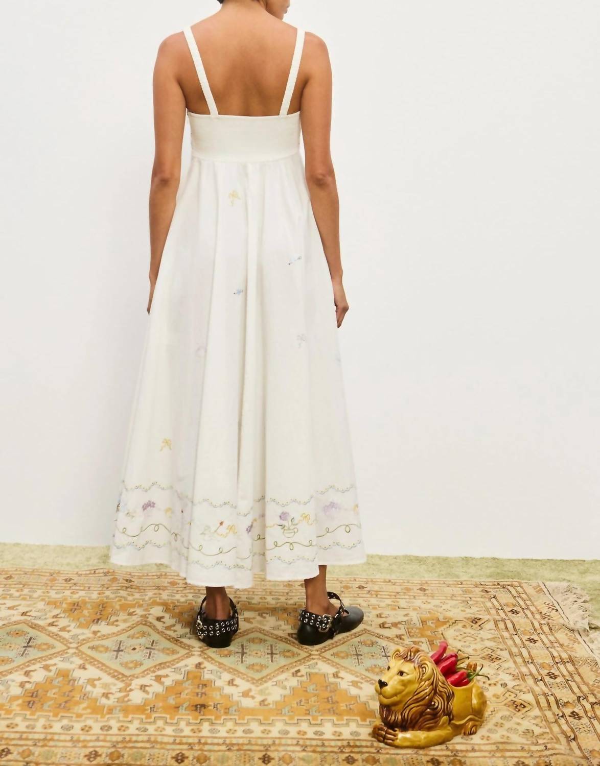 The Giulia Embroidered Sundress by ALEMAIS is a chic addition to your spring wardrobe, perfect for any holiday party. This midi dress in cream features adjustable spaghetti straps and intricate embroidered motifs for a delicate touch. Crafted from 100% Organic Cotton Poplin, it boasts a shirred panel at the back bodice and an invisible side zipper for a seamless fit. With inseam pockets for added convenience, this sundress is both stylish and functional.