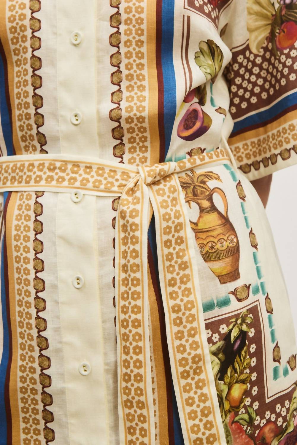 Introducing the Mercado Mini Dress by ALEMAIS, a perfect addition for your holiday party wardrobe. Crafted from 100% European Linen, it features short sleeves with tucks and an elasticated cuff. The dress sports a mini shirtdress silhouette, complete with a point collar and a concealed placket with self-covered buttons. Practical with in-seam pockets and a self-tie belt, this dress is designed for both style and function in a vibrant graphic pattern.