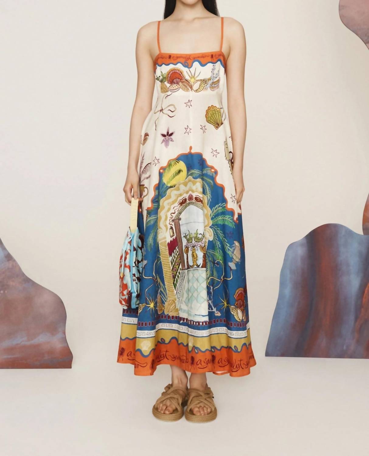 Discover the Surrealist Summer Sundress by ALEMAIS, a delightful midi piece with spaghetti straps perfect for spring. This women’s dress boasts a graphic pattern with artwork in collaboration with Sam Pauletto, crafted from 100% European Flax Linen. It features a shirred panel at the back bodice, side invisible zip closure, and practical in-seam pockets, offering a blend of style and functionality. The partially lined A-line silhouette completes this versatile addition to your warm-weather wardrobe.