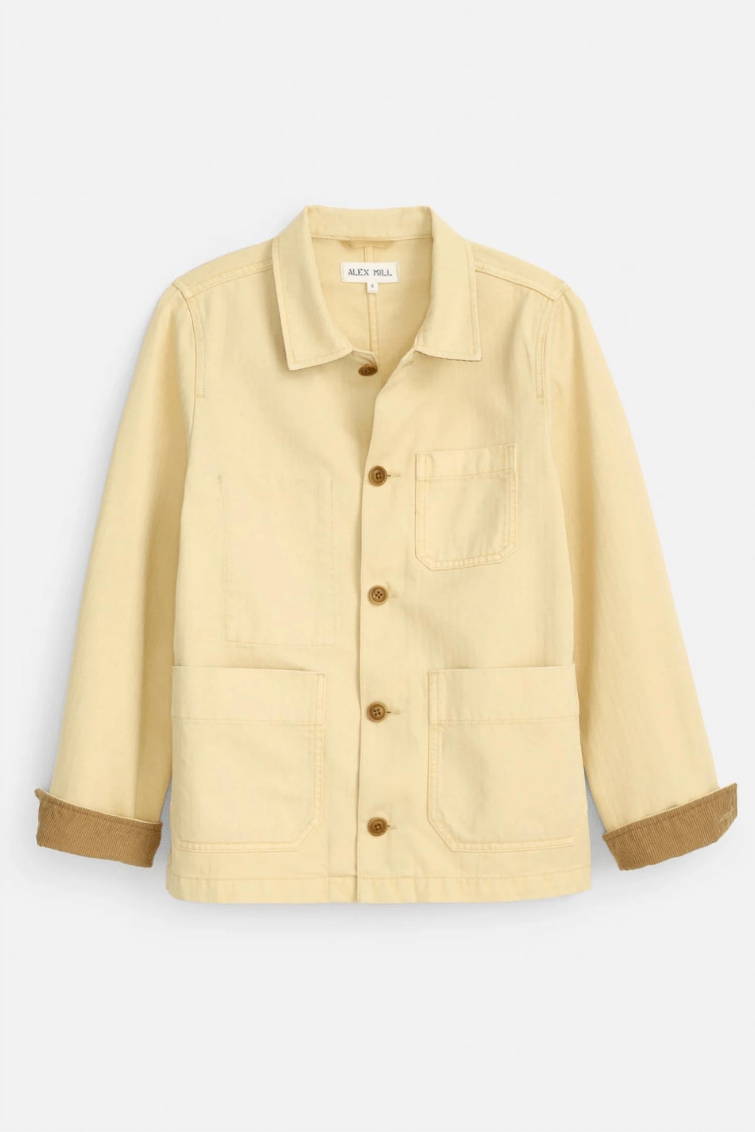 Introducing the Britt Work Jacket by ALEX MILL, a timeless piece that combines functionality with style. With its long sleeves and military-inspired herringbone cotton fabric, this jacket offers a relaxed fit perfect for any holiday party. The 26.5-inch length, corduroy collar, and Corozo button closure reflect its attention to detail, while the garment-dyed beige color adds a unique, rich tone. Care: Machine wash. Ideal for minimalist fall outlooks and Thanksgiving gatherings.