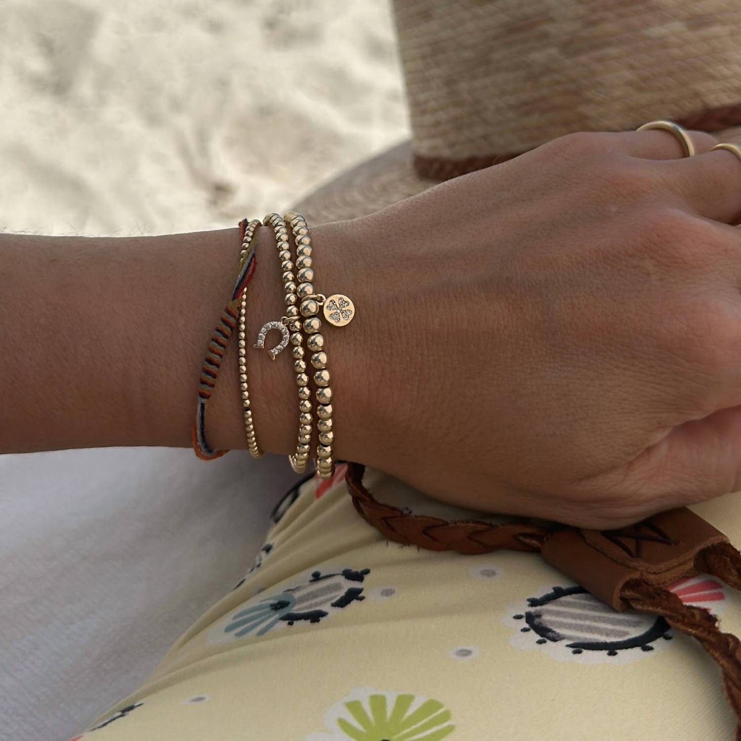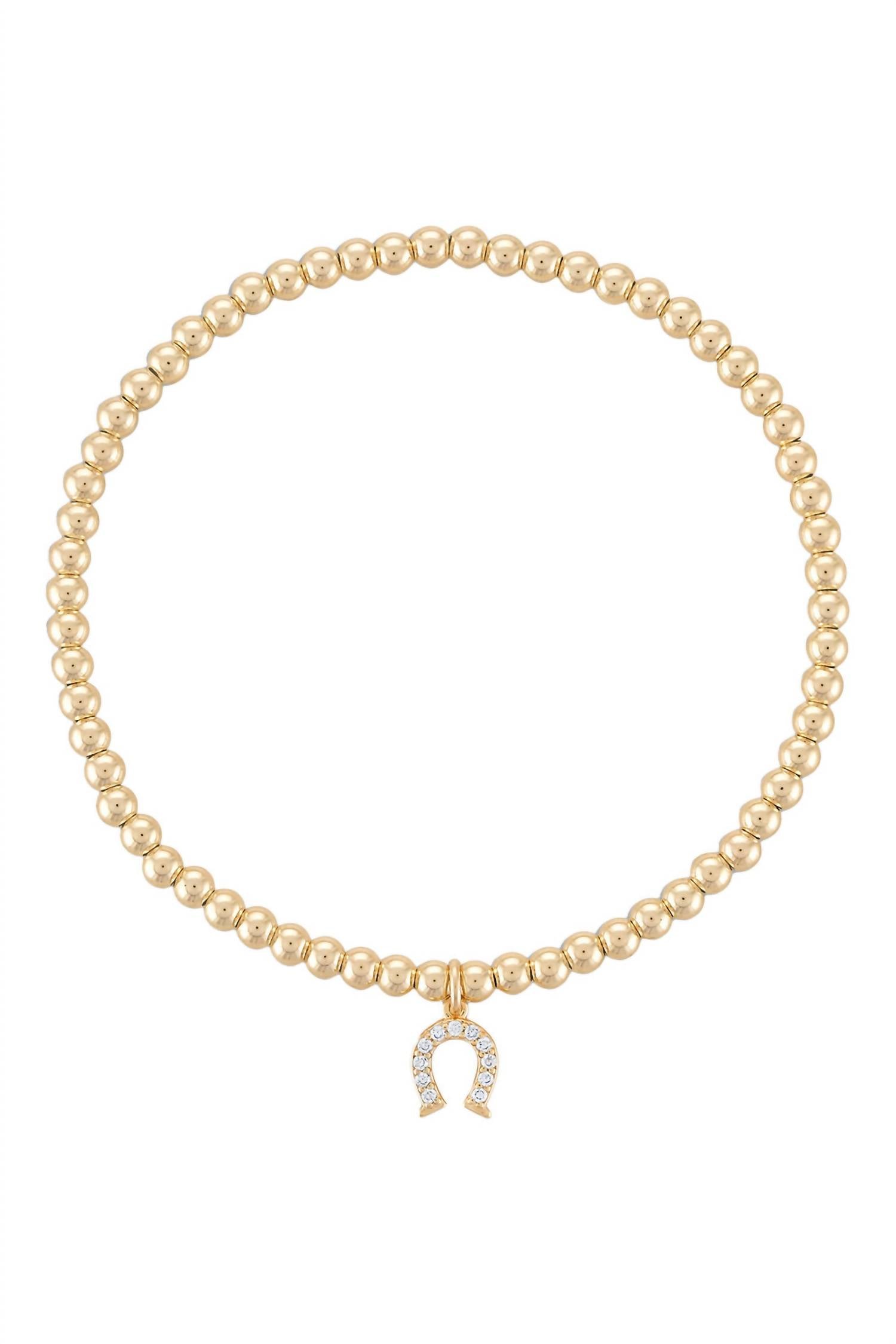 Embrace an elegant touch with the Women's Prosperity Bracelet by Alexa Leigh in a radiant Yellow Gold. Expertly crafted with a 14k gold filled 3mm ball design, this piece features a charming 14k gold filled pave horseshoe charm. Its elastic stretch ensures a comfortable fit for most wrists, enhancing its versatile appeal. Perfect for gifting, this bracelet embodies prosperity and is a luxurious addition to any jewelry collection. Size: 7.5".