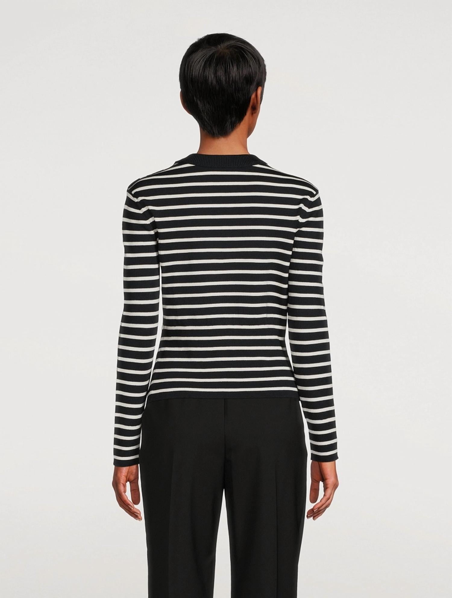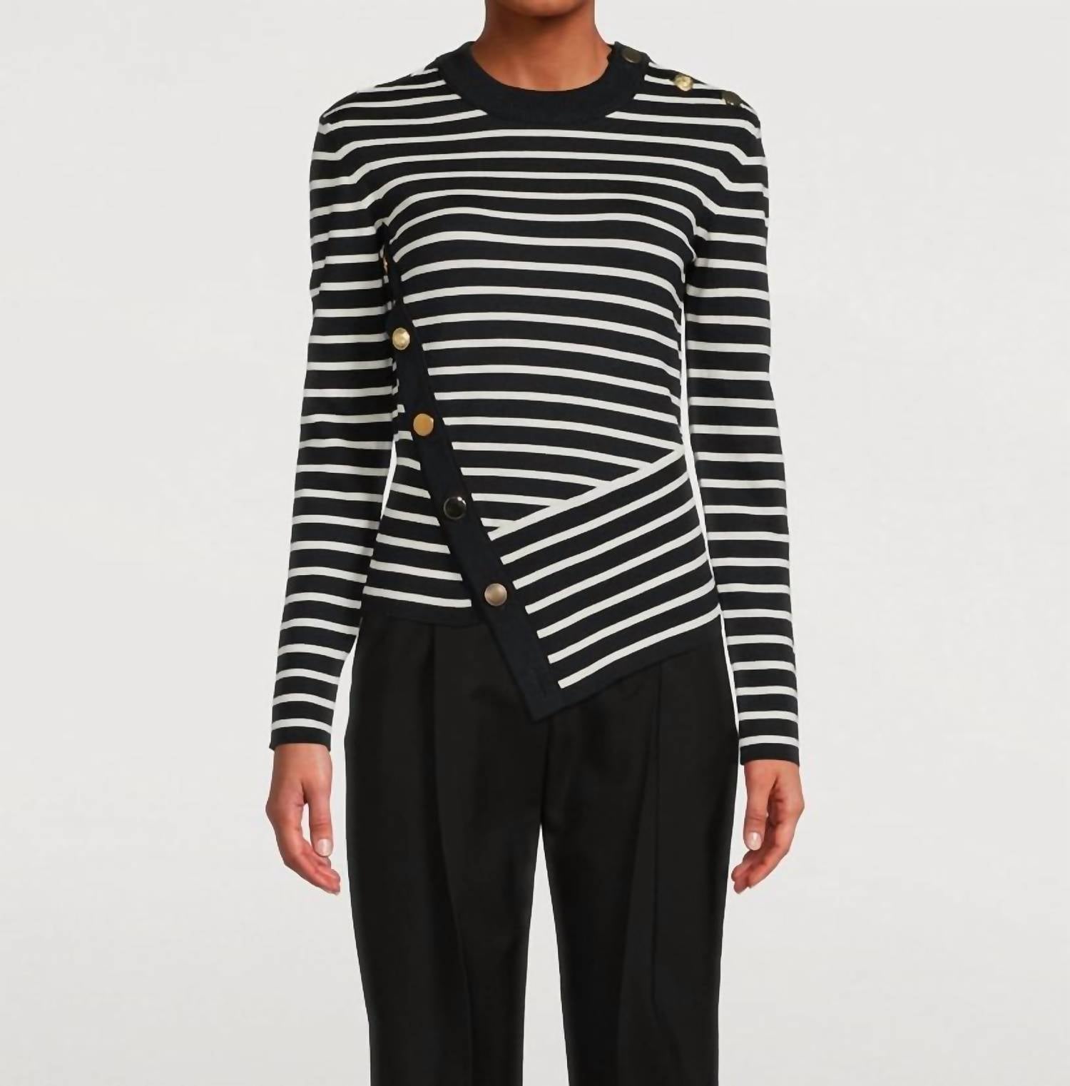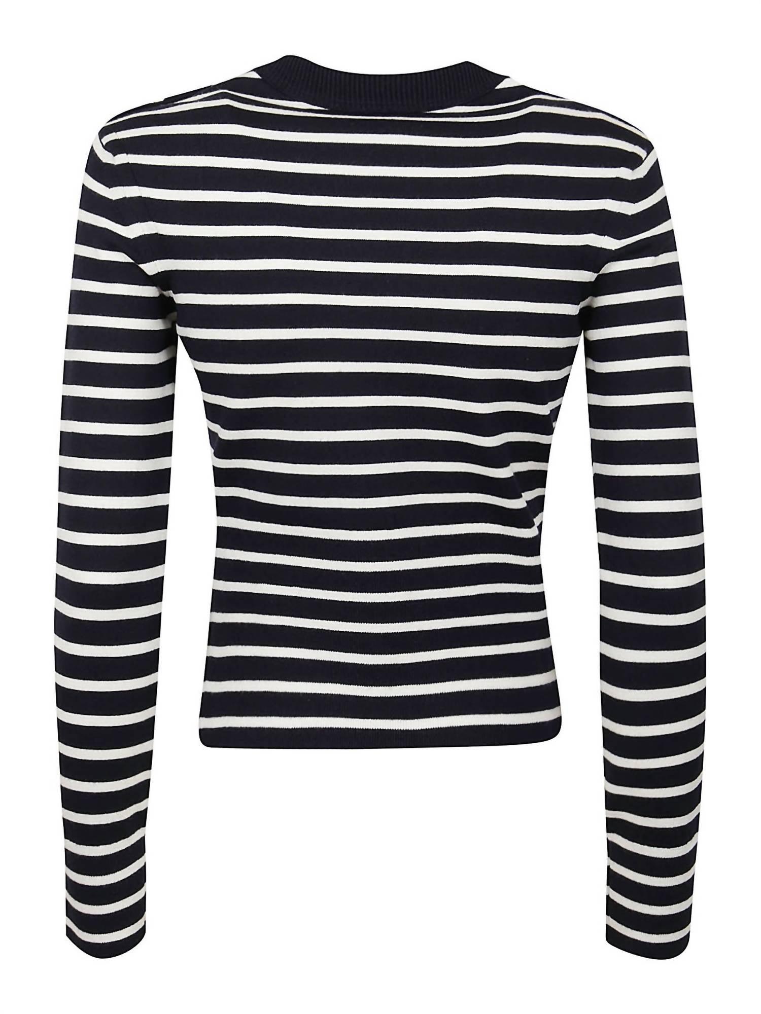 Experience maritime elegance with the Asymmetrical Embellished Stripped Wool Blend Sweater by Alexander McQueen, crafted in Italy. This navy and white piece features long sleeves and a flattering 24-inch length, bringing a nautical-inspired touch with its Breton stripe pattern. Made from a luxurious blend of 87% wool, 11% polyamide, and 2% elastane, the sweater offers a comfortable and chic fit. Closure: Pull-on style. Care: Dry clean recommended.