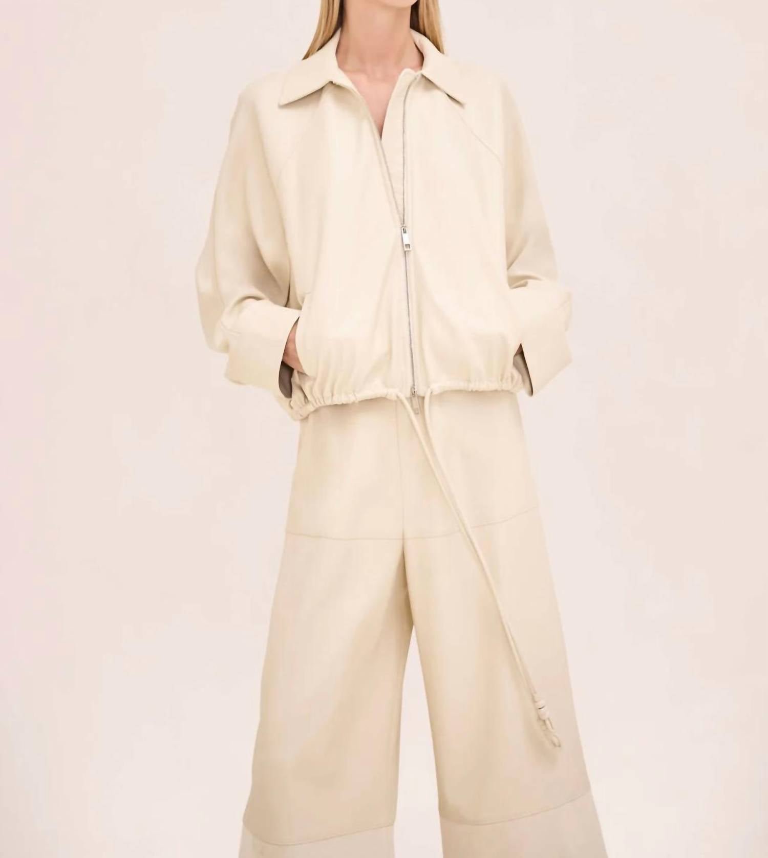 Embrace minimalist elegance with the ALEXIS Channing Jacket, a staple for any spring ensemble. This casual jacket in beige features a relaxed zip-front style and a classic pointed collar. Designed with long sleeves and a solid pattern, it offers no pockets for a sleek finish. Ideal for a dinner party, it combines effortless style with versatility, perfect for the modern woman. Model wears an XS (Height: 5'10", Bust: 34B, Waist: 25", Hips: 35").