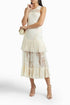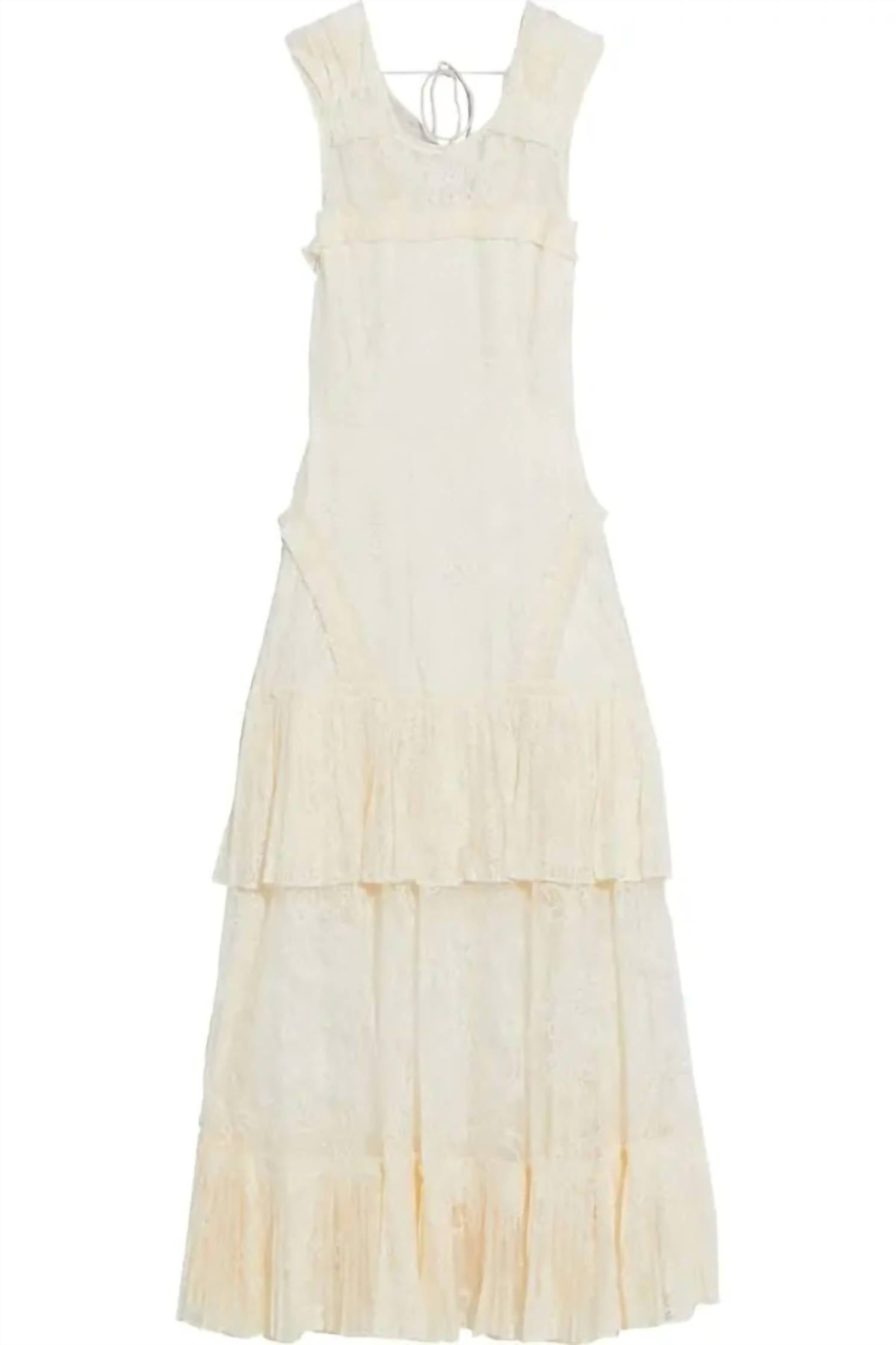 This Chantilly lace dress features pleated, tiered detailing and ties at the back for a delicate, feminine silhouette. Partially lined and crafted from non-stretchy, mid-weight fabric, it offers structure and elegance. Designed with a concealed hook-and-zip fastening at the back, it is made from 94% nylon and 6% elastane, requiring dry-clean care to maintain its refined finish.
