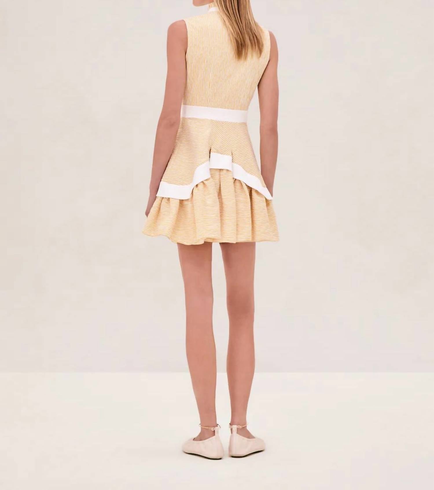The kind of easy and flattering dress you'll be reaching for all season long. Introducing the Natacha Mini Dress by ALEXIS, a stunning choice for both casual and formal settings with its playful yellow stripe pattern and chic A-line silhouette. This sleeveless dress showcases a herringbone texture and a pleated skirt with a button front closure hidden beneath a stylish placket. Made from 97% Polyester and 3% Elastane, this dress offers comfort and flexibility. Care for this summer standout is simple: dry clean only.