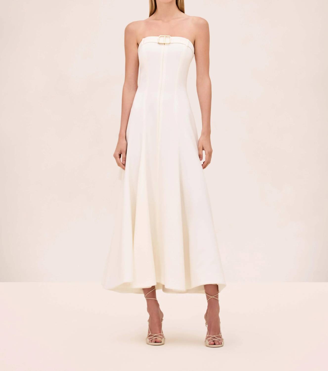Introducing the Women's Pearse Dress by ALEXIS, a chic choice for your summer vacations. This strapless dress boasts an elegant A-line silhouette and a unique belted squareneck detail, perfect for a boho chic vibe. Tailored in a solid white, this midi dress features a pull-on closure for ease and style. Made for those sunny days, it's a versatile addition to any wardrobe.