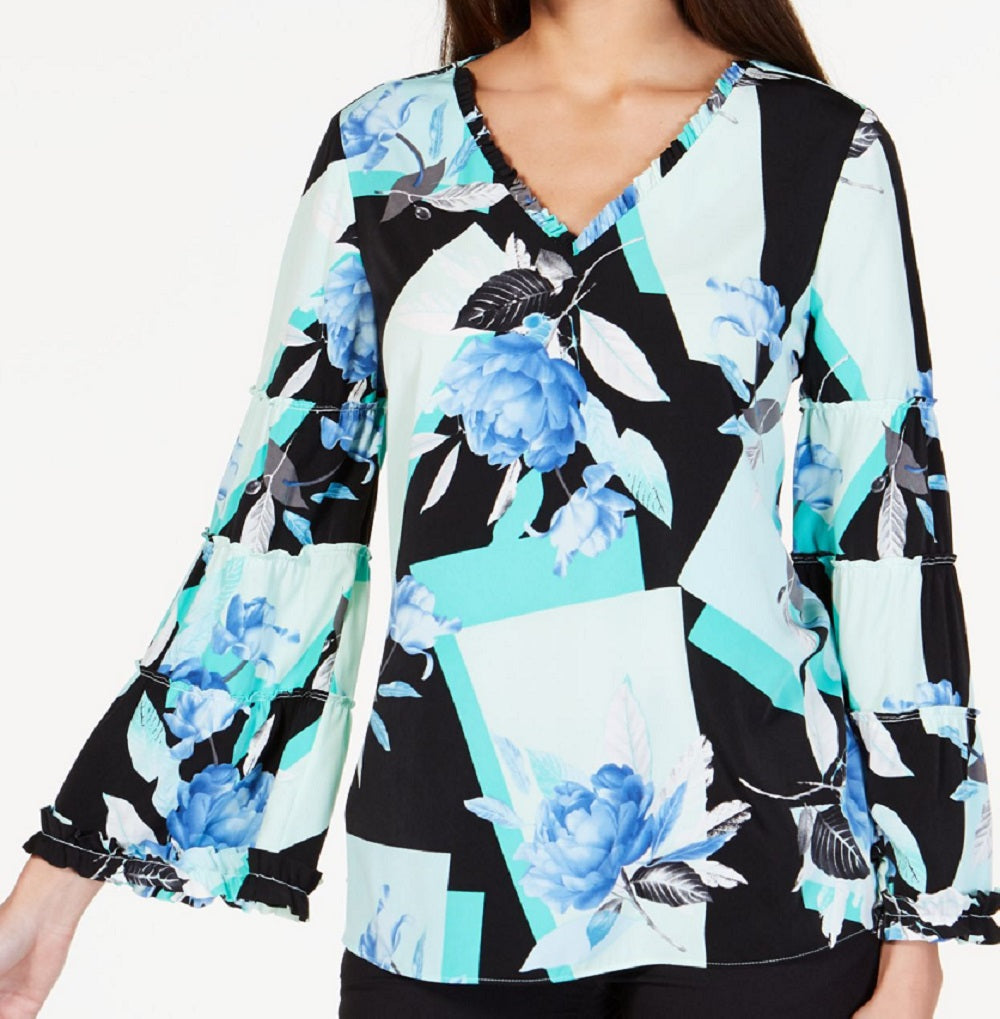 Blusa Alfani Feminina Aqua com Babados e Estampa Manga Longa e Gola V, Preta, Tamanho X-G