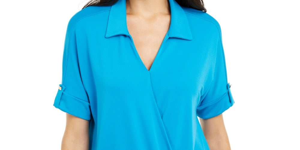 Comprimento aproximado de 21-3/8 | Projetado para se ajustar e valorizar pessoas de 1,62 m ou menos | Gola alta com sobrepeliz | Mangas curtas com aba de botão | Poliéster/elastano