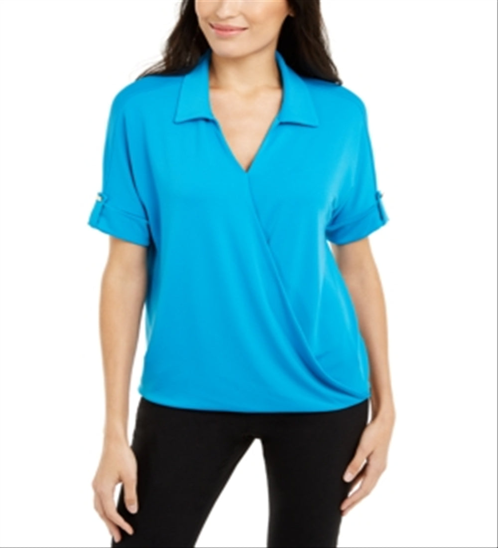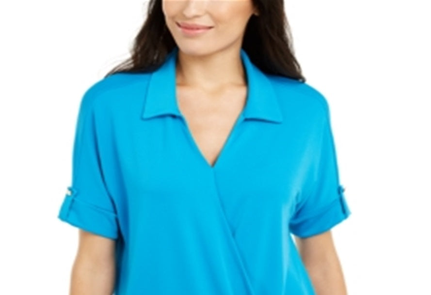 Blusa de malha com gola Alfani feminina, azul turquesa selvagem, tamanho pequeno, extrapequeno