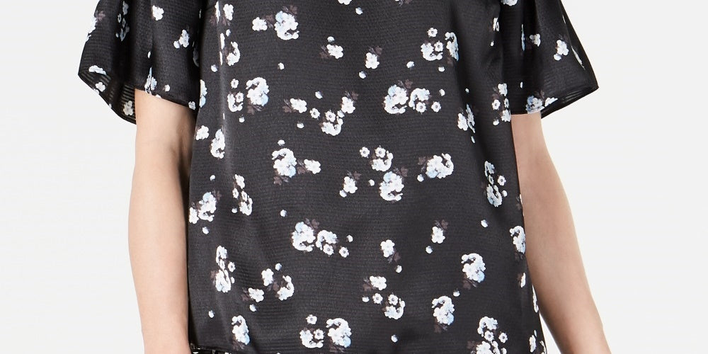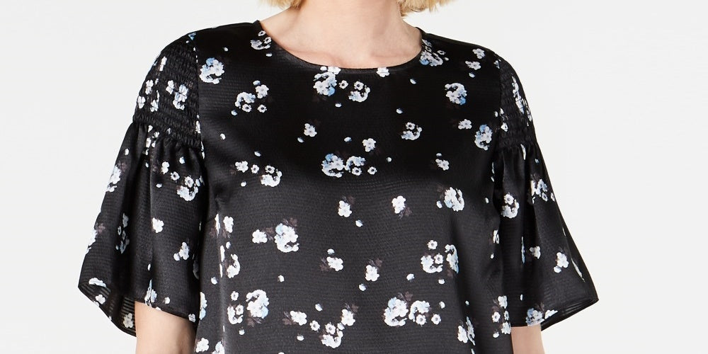 Blusa feminina Alfani com estampa floral e ombros franzidos em cetim, preta, tamanho grande
