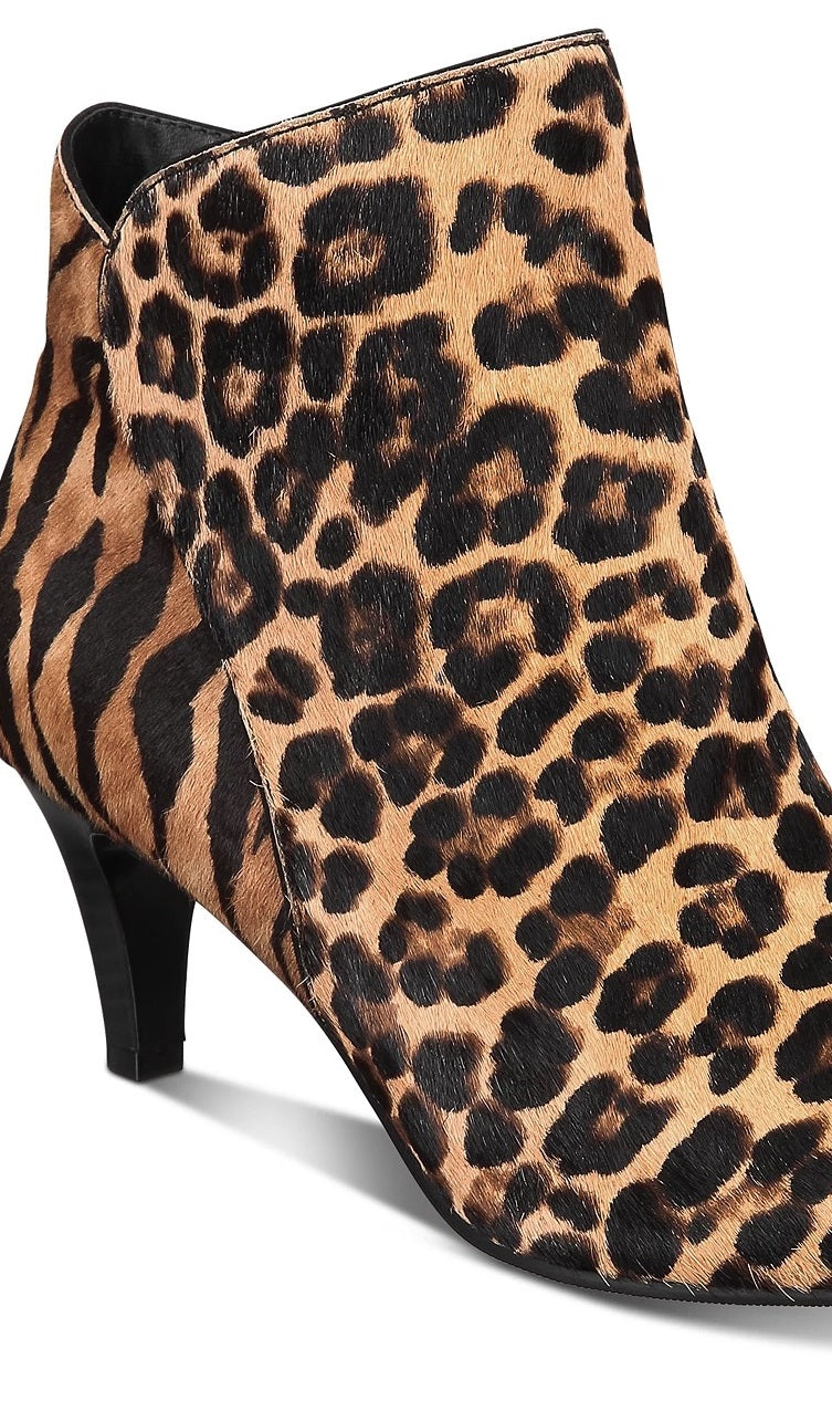Salto gatinho de 2" | Botas de cano curto com bico amendoado e fecho de zíper completo | Tecnologia Step 'N Flex para maior conforto | Pelo de bezerro genuíno tingido e em pedaços | Origem da pele: China | Cabedal em couro/pelo de bezerro; forro sintético; sola de borracha | Importado