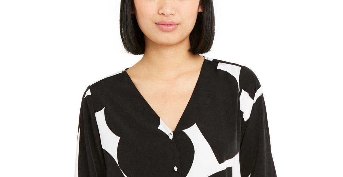 Aproximadamente 27" de comprimento | Decote em V; fecho de botão na frente | Mangas 3/4 franzidas com abas | Mangas 3/4 franzidas com abas
