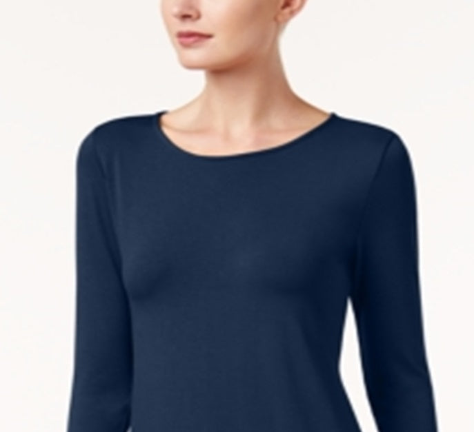 Um decote redondo elegante acrescenta um charme infinito à silhueta fluida deste top Alfani | projetado com costas trançadas que caem lindamente. | Decote redondo | Design de mídia mista com costas trançadas | Mangas 3/4 | Acabamento no quadril
