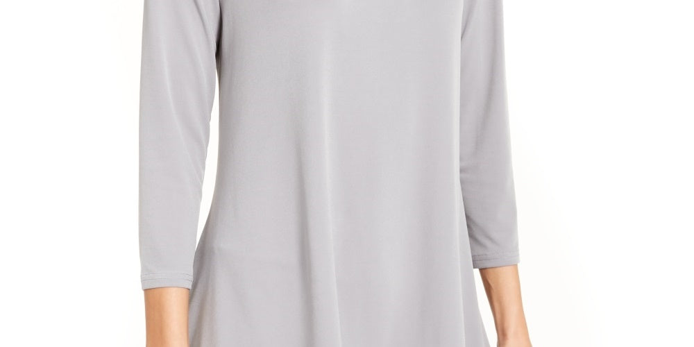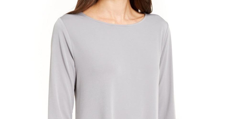Decote redondo | Estilo pulôver | Mangas três quartos | Ajuste fácil | Sem forro | Bainha alta e baixa