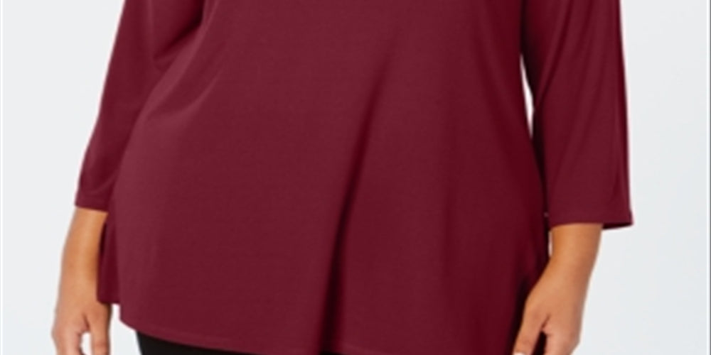 O caimento rodado da túnica plus size da Alfani é acentuado pela bainha alta e baixa, que proporciona cobertura extra nas costas. O decote é finalizado com uma tira com fivela para um toque moderno. | Decote em V | Alça e fivela decorativas na abertura da fechadura; bainha alta e baixa | Mangas 3/4 | Ajuste fácil; comprimento na altura do quadril |