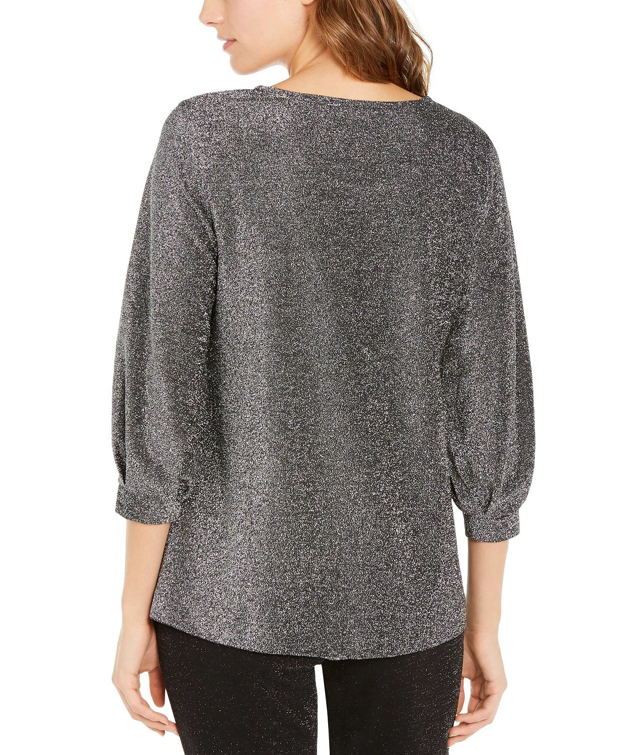 Aprox. 26-3/8" de comprimento | Decote redondo | Malha metálica | Mangas 3/4 estilo bispo | Nylon/poliéster/fio metálico/elastano