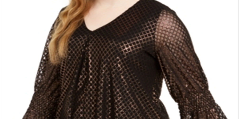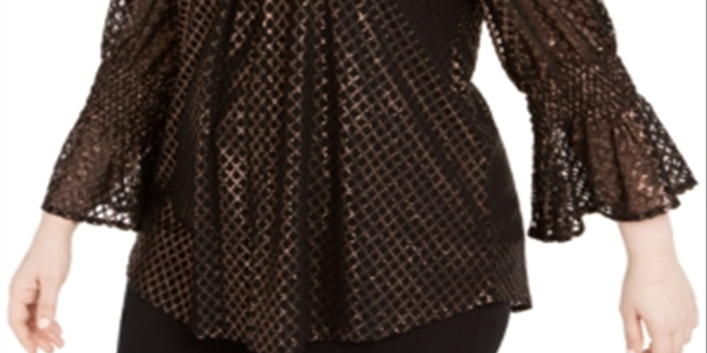 Brilhe a noite toda com o lindo top plus size da Alfani | um lindo design alegre acentuado com uma estampa metálica glamourosa e finalizado com mangas sino românticas