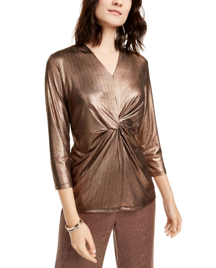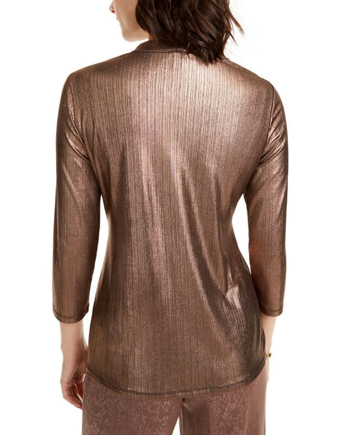 Aproximadamente 25-3/8" de comprimento | Decote em V | Acabamento metálico; detalhe torcido na cintura frontal | Mangas 3/4 | Poliéster/elastano