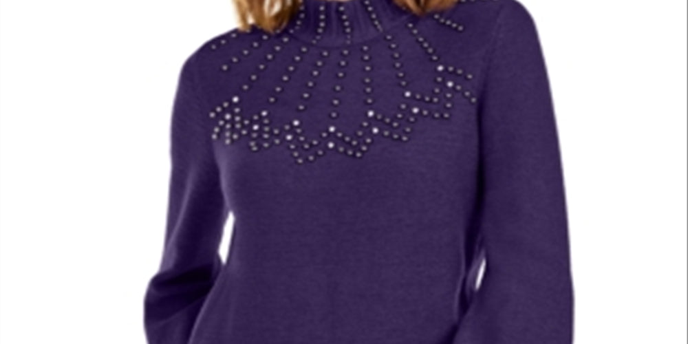 Alfani faz você desejar a temporada de suéteres com esta peça pequena | com gola alta e mangas bufantes | Contas redondas pingam do decote para um acabamento que emoldura o rosto