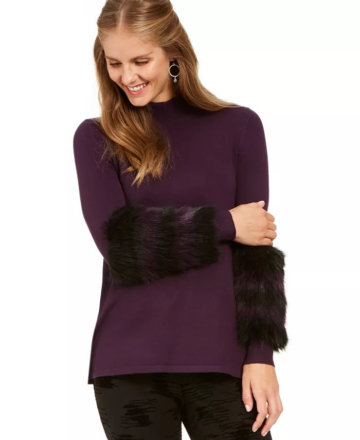 Ajuste no quadril | Projetado para se ajustar e valorizar pessoas de 1,62 m ou menos | Gola alta falsa | Detalhes listrados de pele sintética acima do punho; canelado no decote e nos punhos | Corpo: rayon/nylon; pele sintética: acrílico/modacrílico/poliéster