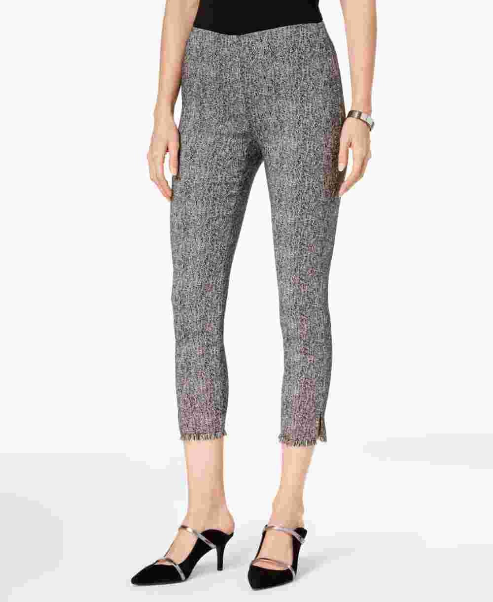 Costura interna aproximada: 24" | Altura frontal aproximada de 10"; Altura traseira aproximada de 15-1/2"; ajuste justo nos quadris e coxas; perna fina chega ao tornozelo | Projetado para se ajustar e valorizar pessoas de 5'4" ou menos | Braguilha com fecho de colchete na frente | Rayon/nylon/elastano