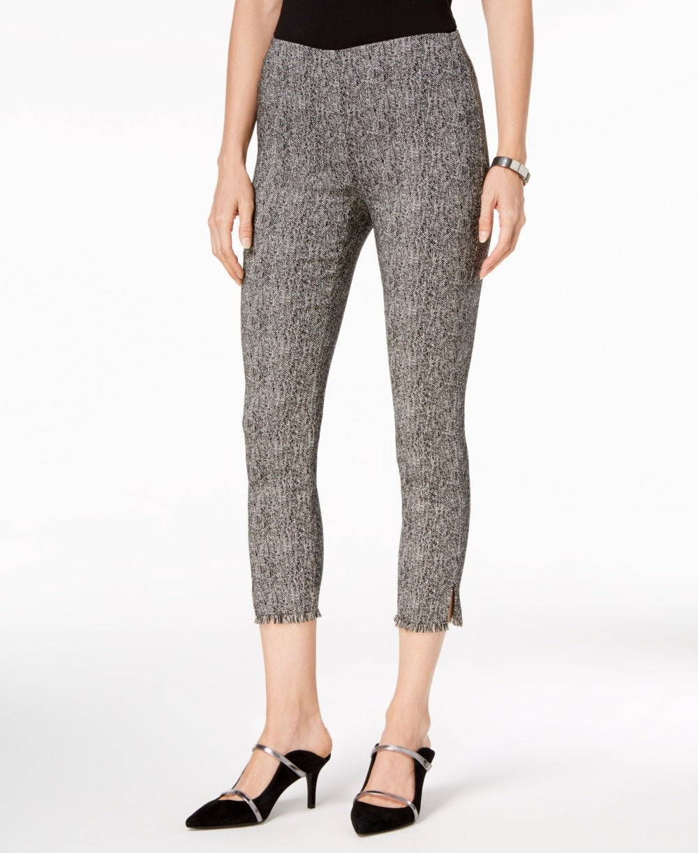Costura interna aprox.; 24 | Altura frontal aprox. 10; Altura traseira aprox. 15-1/2; ajuste justo nos quadris e coxas; perna fina chega ao tornozelo | Projetado para se ajustar e valorizar pessoas de 1,62 m ou menos | Braguilha com fecho de colchete na frente | Rayon/nylon/elastano