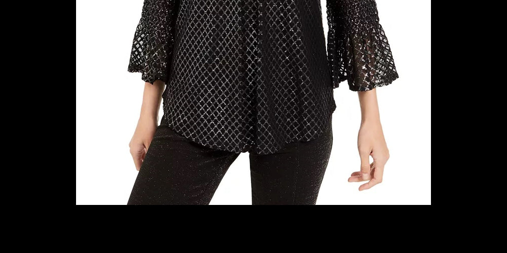 Blusa feminina Alfani Petite com estampa metálica e manga franzida, preta, tamanho PL