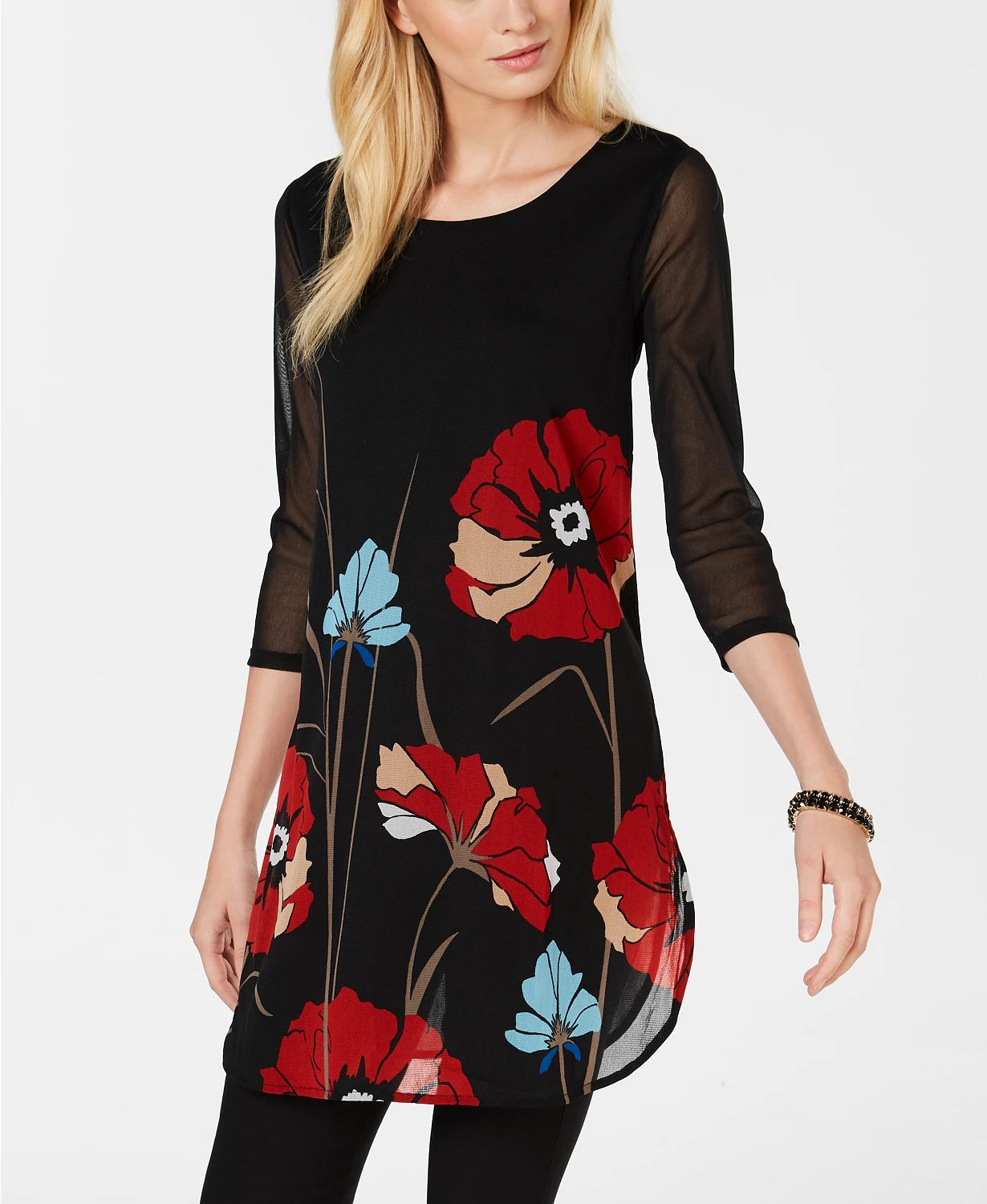 Decote redondo | Aberturas nas bainhas laterais | Mangas 3/4 | Abaixo do quadril | Projetado para se ajustar e valorizar pessoas de 1,62 m ou menos