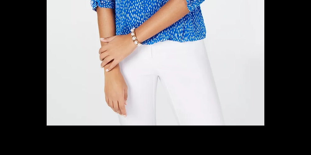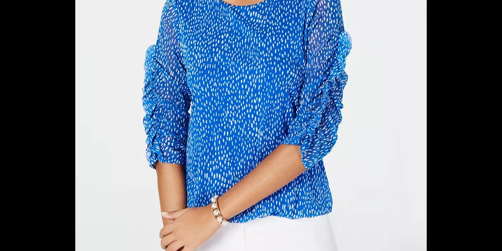 Ajuste relaxado; ajusta-se ao quadril | Projetado para se ajustar e valorizar pessoas de 1,62 m ou menos | Decote redondo | Bainha com bolhas | Mangas 3/4 com detalhes franzidos