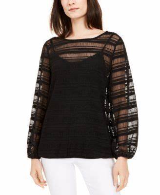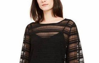 Blusa feminina Alfani Petite Sheer-Stripe com manga balão, preta, tamanho pequeno médio