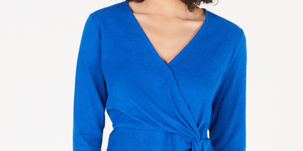 Ajuste no quadril | Projetado para se ajustar e valorizar pessoas de 1,62 m ou menos | Decote sobrepeliz | Estilo falso com detalhe de nó na lateral | Mangas 3/4