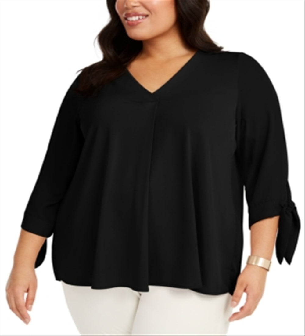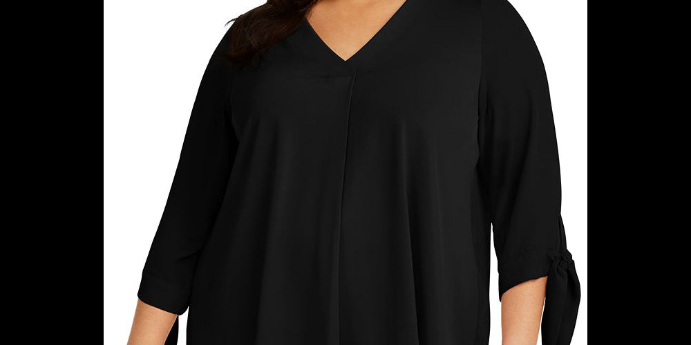 As pregas polidas na frente e nas costas acrescentam amplitude que combina com o estilo fluido do top plus size da Alfani, finalizado com laços suaves nas mangas. | Comprimento aproximado de 29 | Decote em V | Prega invertida no centro da frente; detalhe plissado abaixo do jugo traseiro | Mangas 3/4 com laços nos punhos |