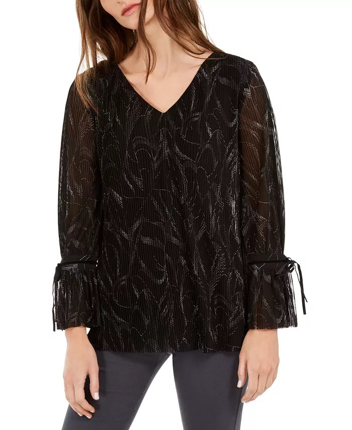 Aproximadamente 63 cm de comprimento | Decote em V | Sobreposição plissada semitransparente; amarrações nos punhos | Poliéster; forro: nylon | Lavável à máquina