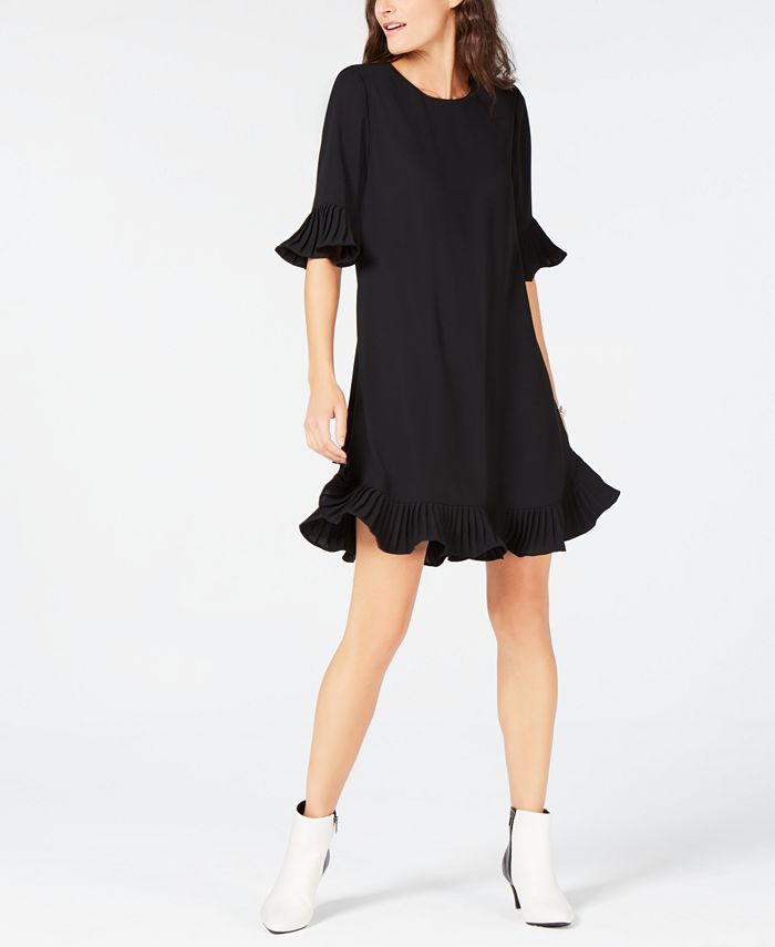 O acabamento plissado adiciona movimento sofisticado a este pequeno vestido evasê da Alfani. | Projetado para se ajustar e valorizar pessoas de 1,62 m ou menos | Gola redonda; corte evasê | Zíper traseiro com fecho de colchete | Acabamento plissado nas mangas ¾ e na bainha | Poliéster; forro de poliéster