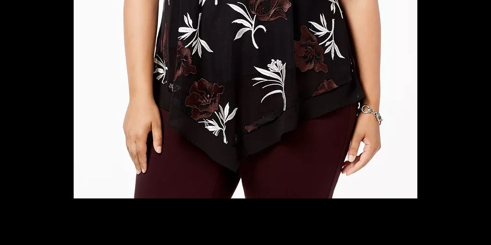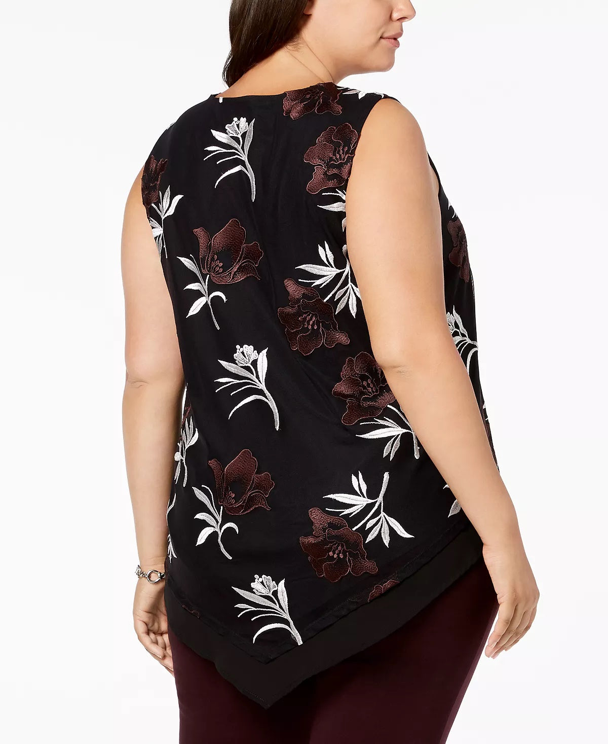 Ajuste fácil; ajuste no quadril | Decote redondo | Bainha pontuda na frente e atrás | Nylon; bordado; poliéster