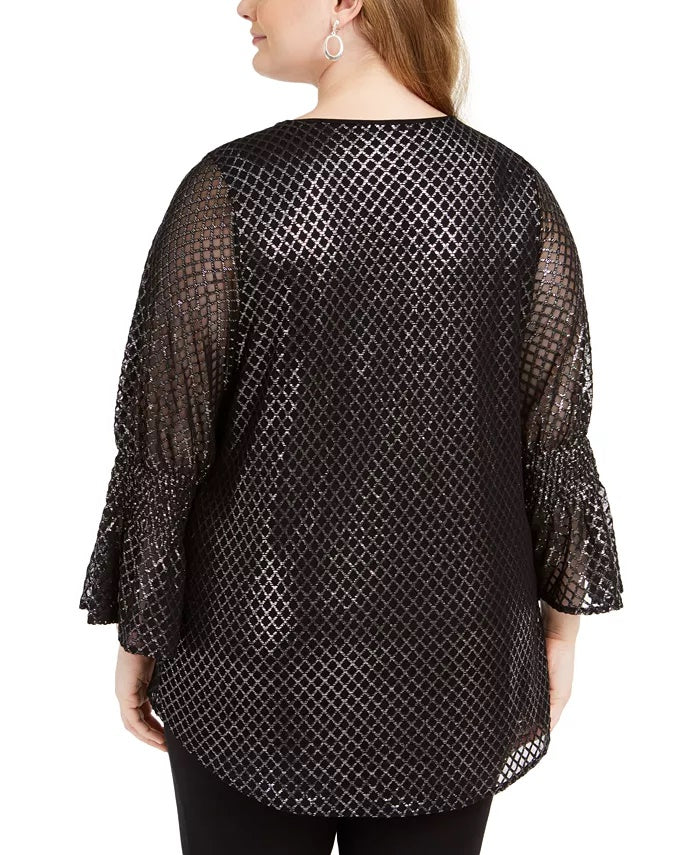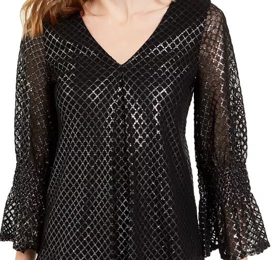 Decote em V | Estampa metálica semitransparente | Mangas sino 3/4 | Forrado | Nylon/poliéster; forro: nylon