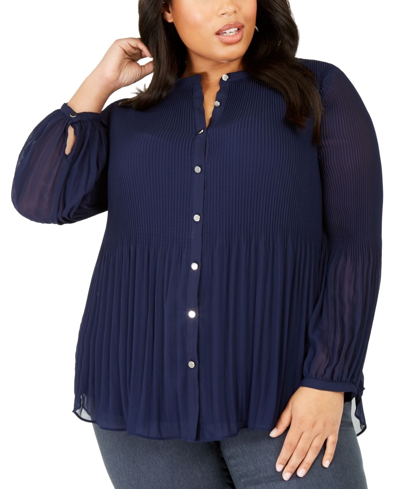 Decote com faixa; fecho frontal com botões | Pregas em toda a peça | Mangas compridas com detalhe plissado e punhos abotoados | Poliéster | Lavável à máquina
