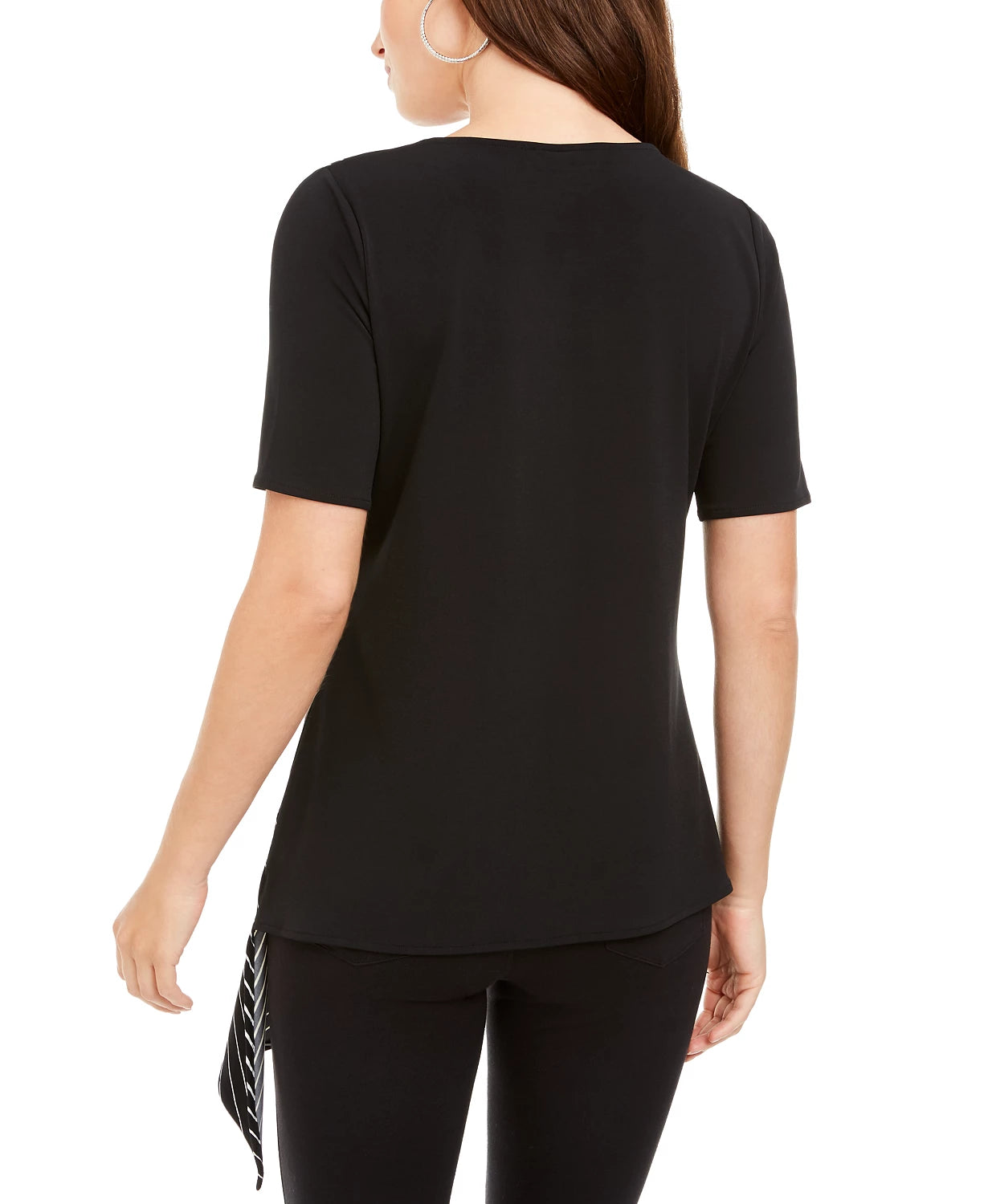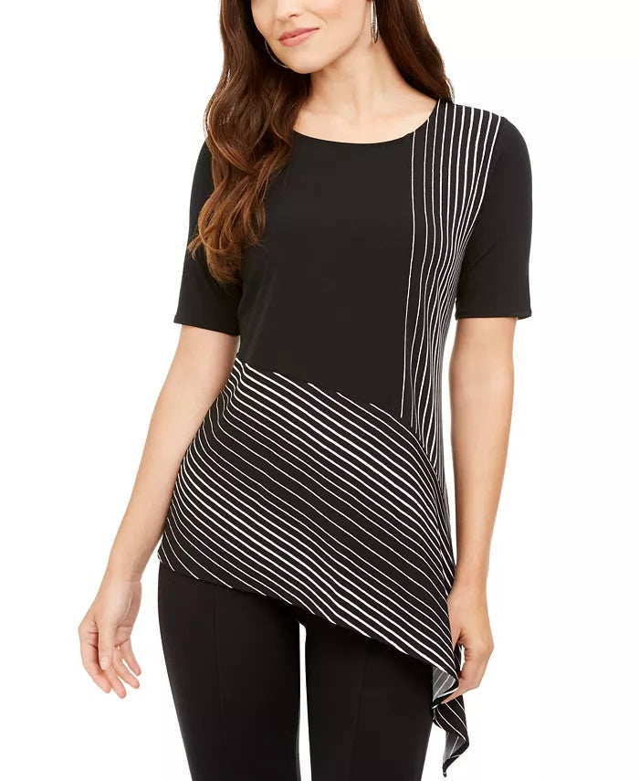 Aproximadamente 27-3/4" de comprimento | Decote redondo | Estampado na frente; bainha assimétrica | Poliéster/elastano | Lavável à máquina