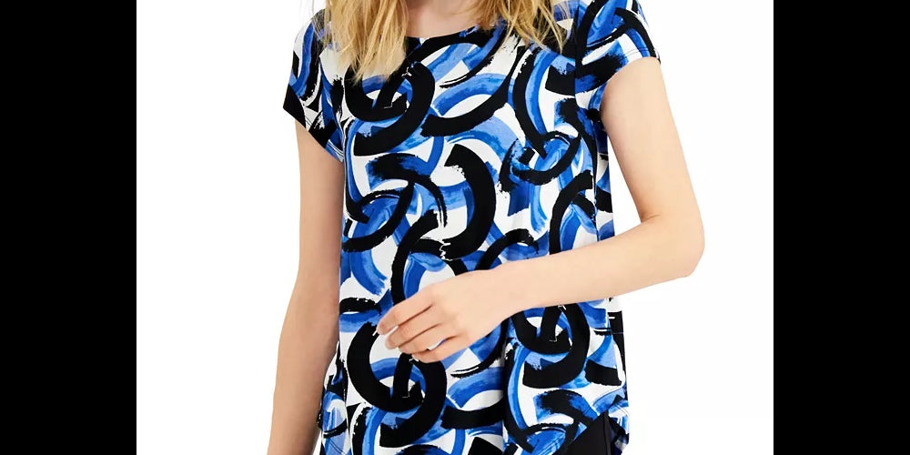 Camiseta feminina Alfani estampada com bainha redonda, preta, tamanho pequeno pequeno